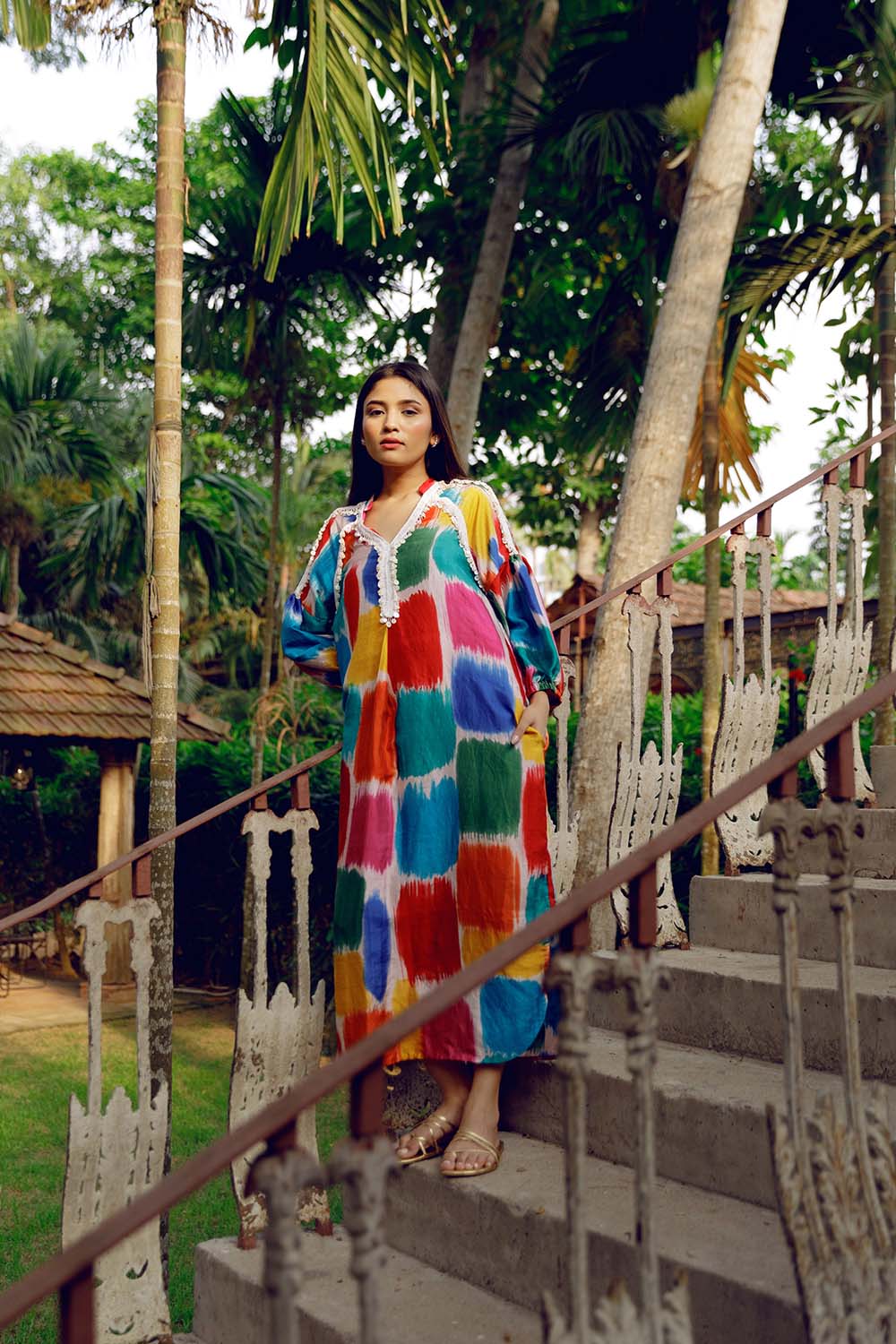 Multicolour brush stroke print, handwoven mulberry silk straight cut dress with a woven shell trim edging along the shoulder and neckline.