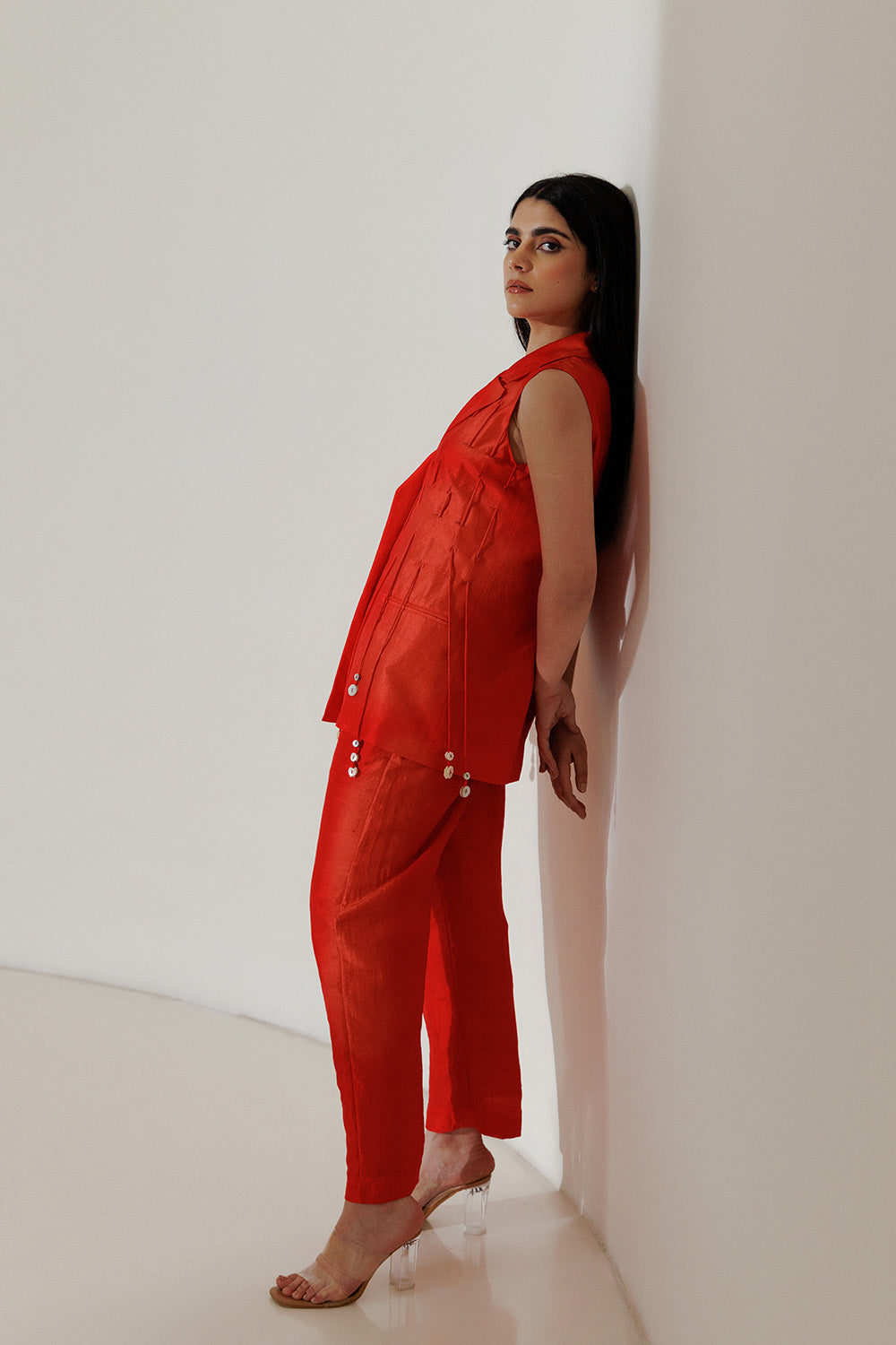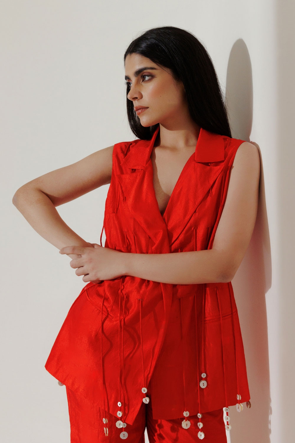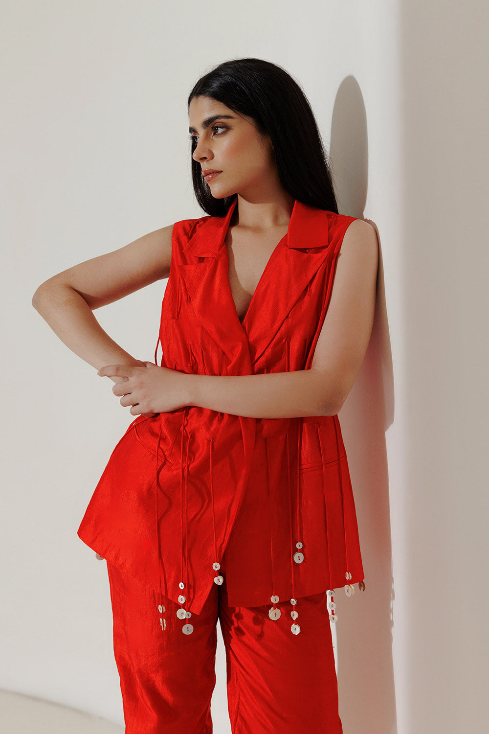 Red handwoven mulberry silk boxy jacket with an all over interwoven cord detailed texture finished with shell embroidery at the cord hems.