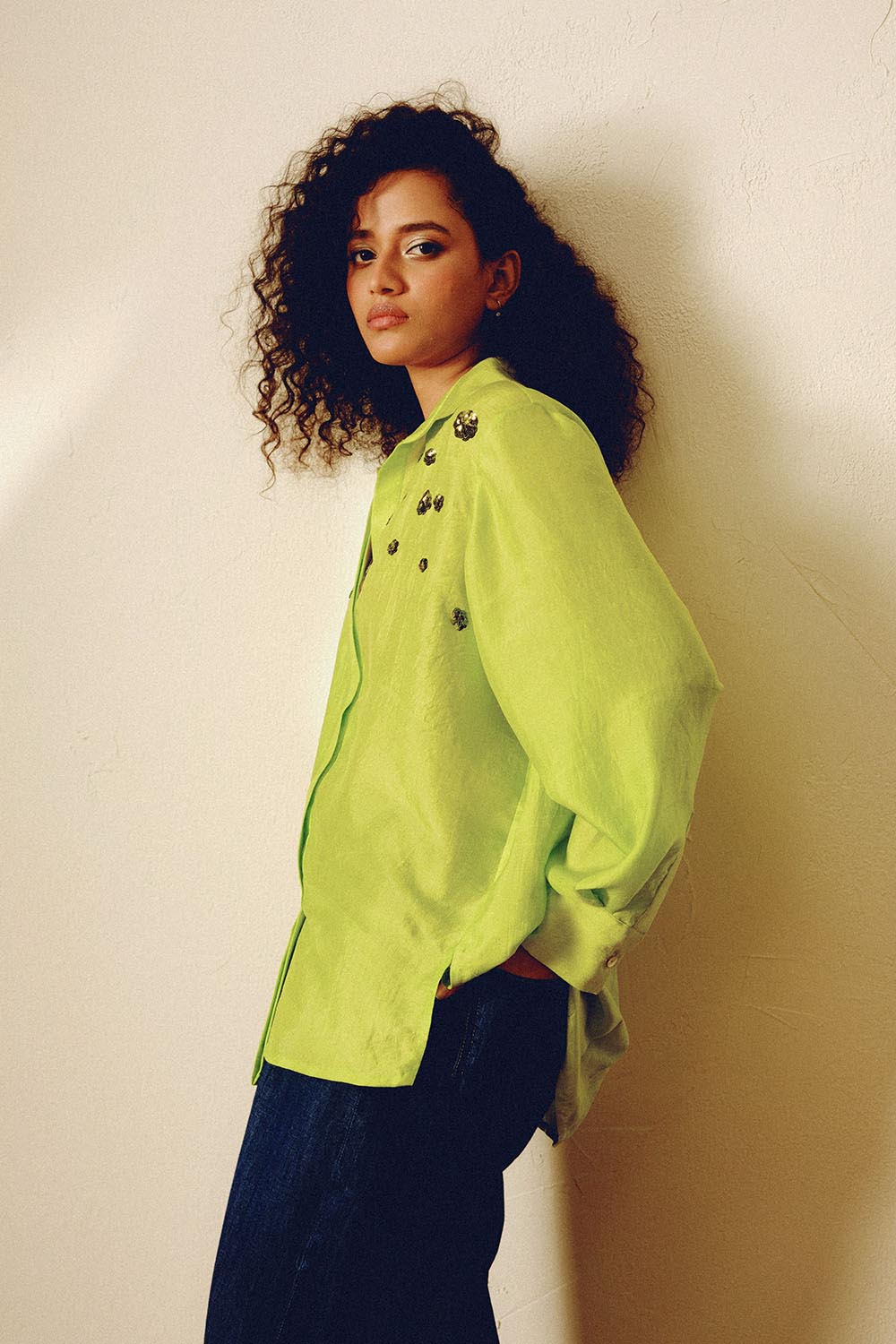 Handwoven and light mulberry silk shirt with hand embroidered sequin motifs. This bright colour and relaxed fit is perfect for all seasons.