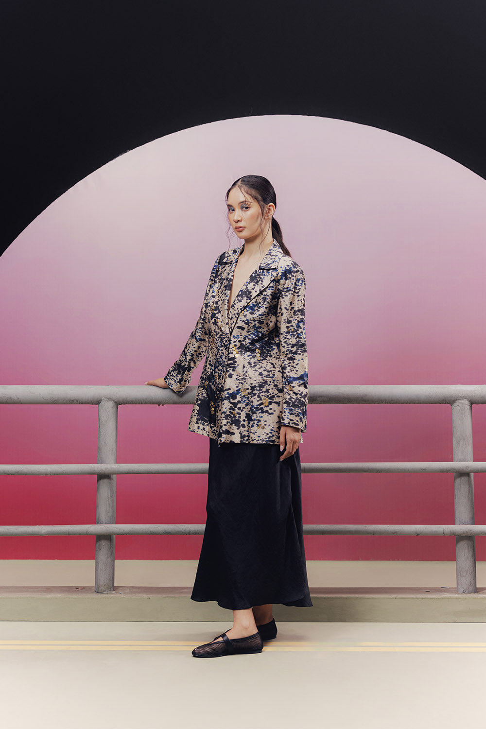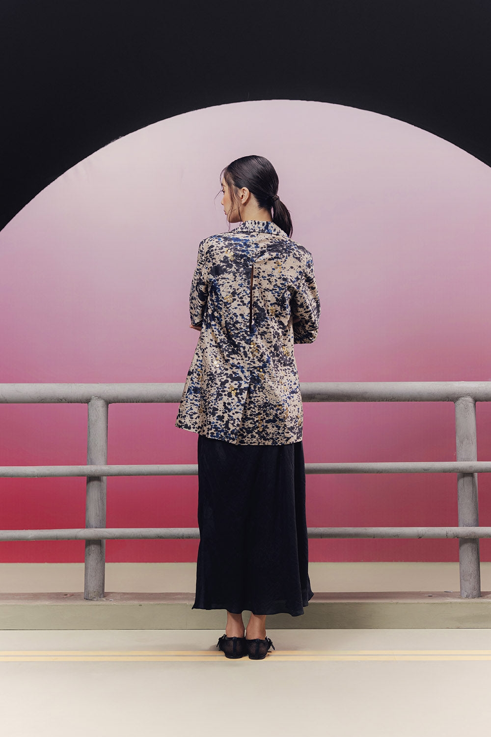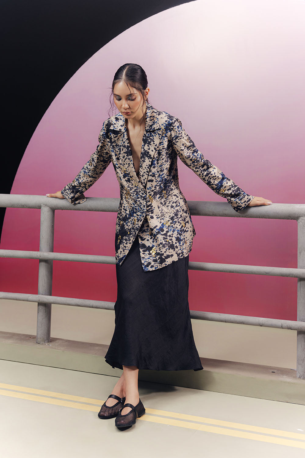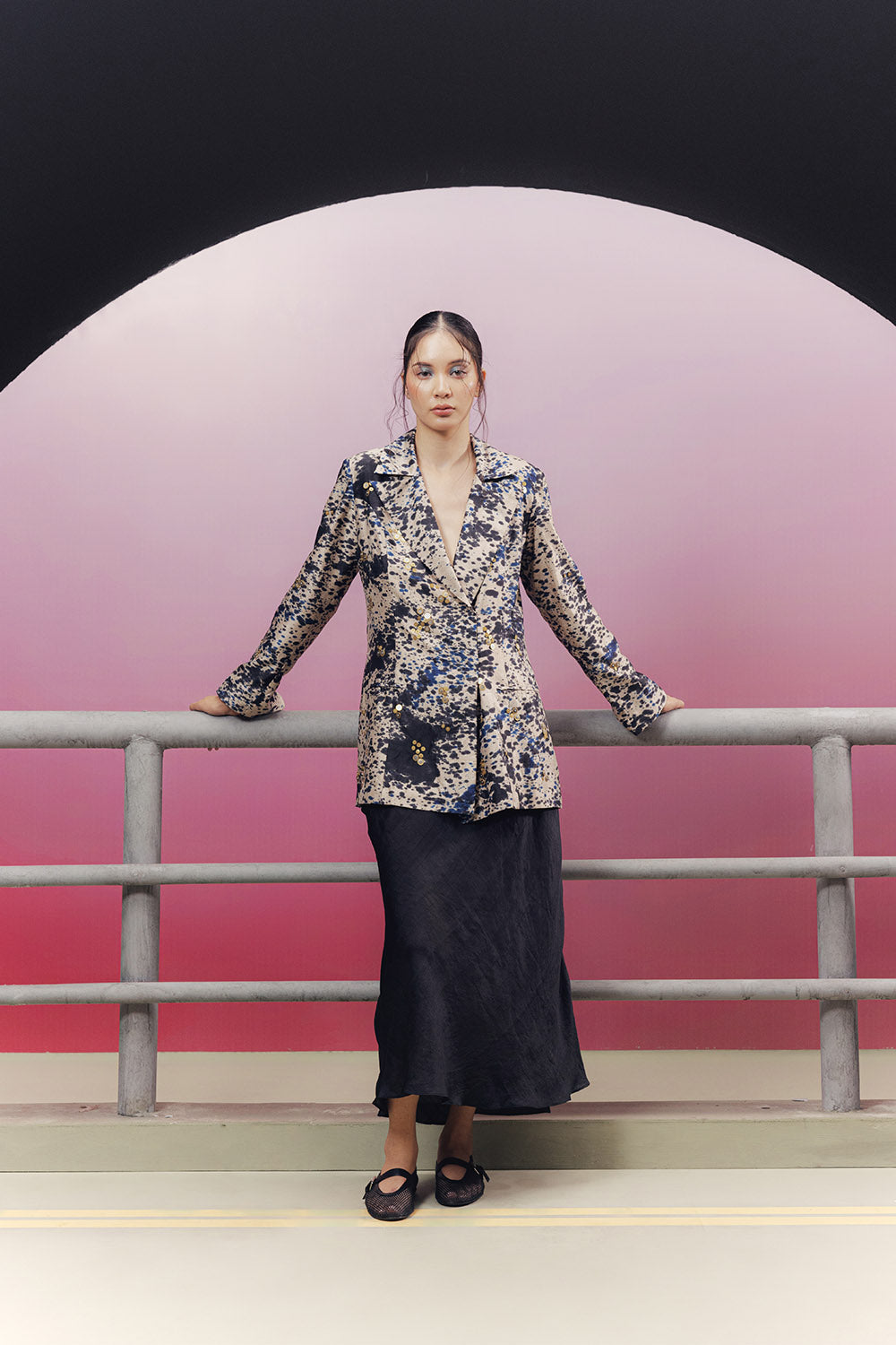 Handwoven and hand-painted silk blazer with metal sequin embroidery.