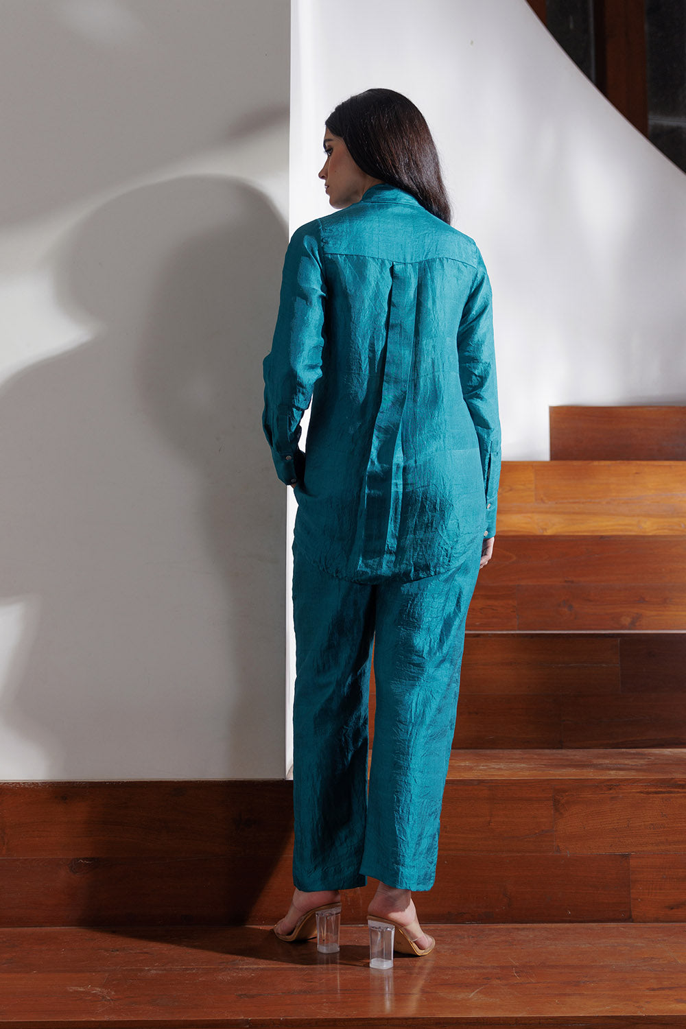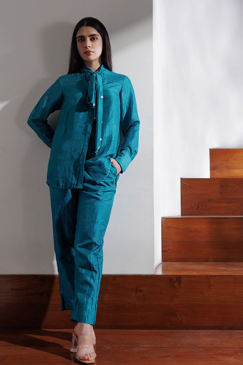 The shirt is paired with high waisted relaxed ankle grazer trousers.