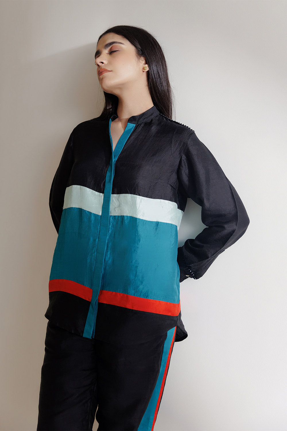 Multicolour handwoven mulberry silk contrast panelled shirt with black bead edging on the shoulder.