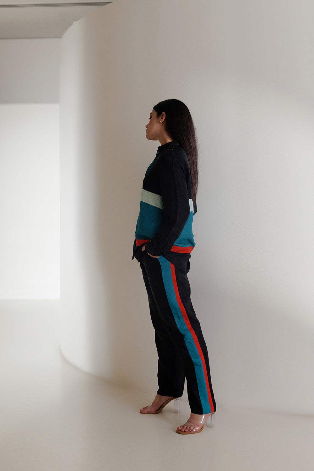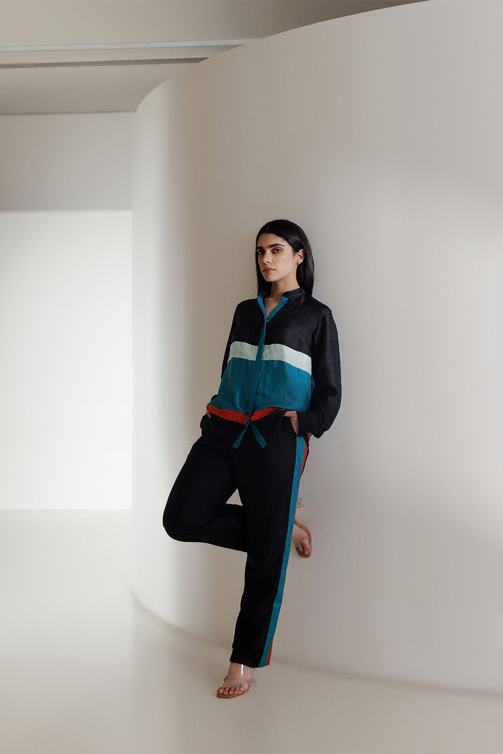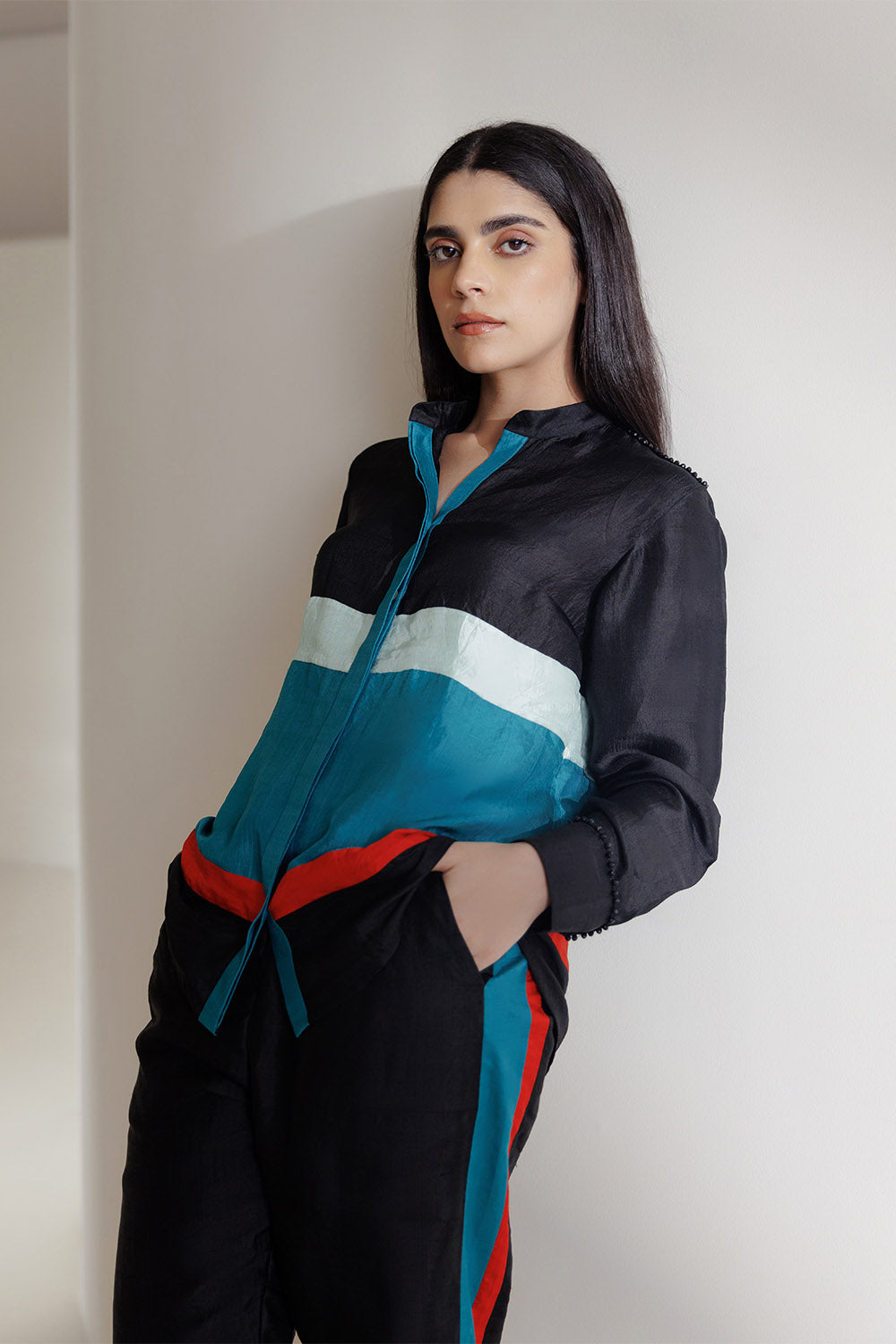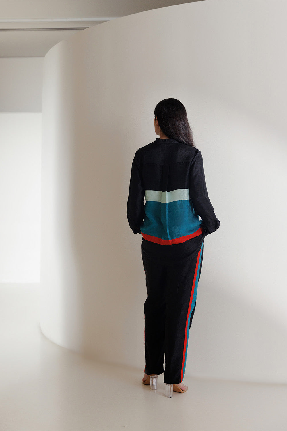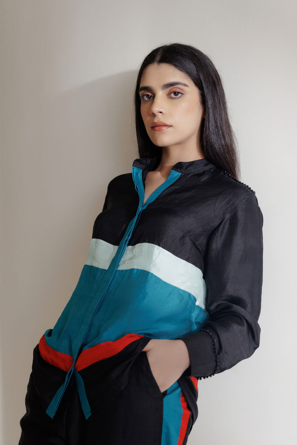 Multicolour handwoven mulberry silk contrast panelled shirt with black bead edging on the shoulder.