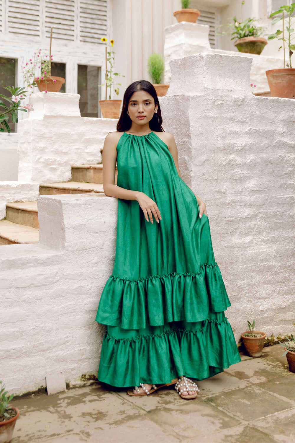 Green handwoven mulberry silk ruffled hem strappy dress with a back tie shell button detail. It also has pockets on each side.