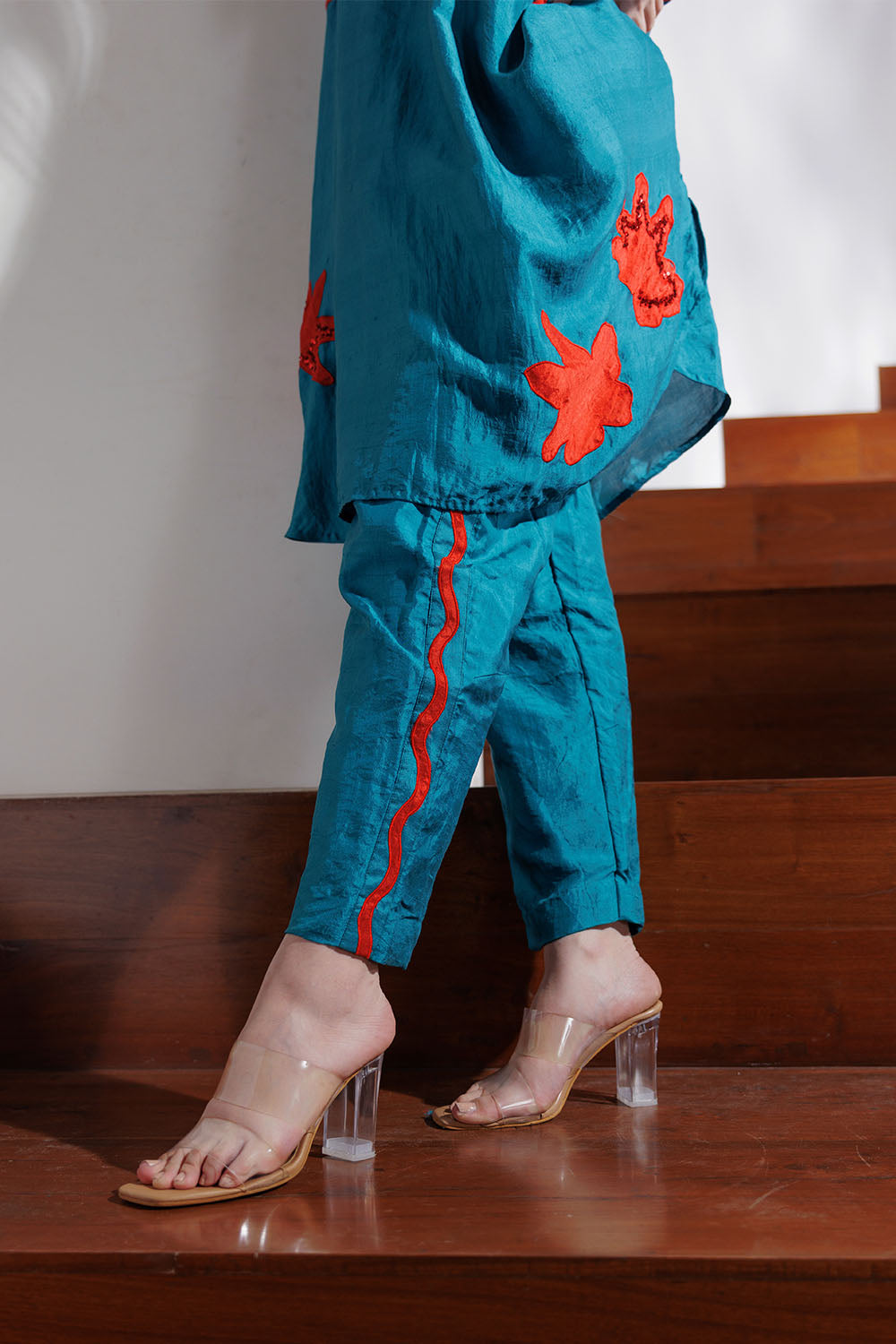 Teal handwoven mulberry silk free size tunic with contrast red applique motifs. Some motifs are embellished with sequins.