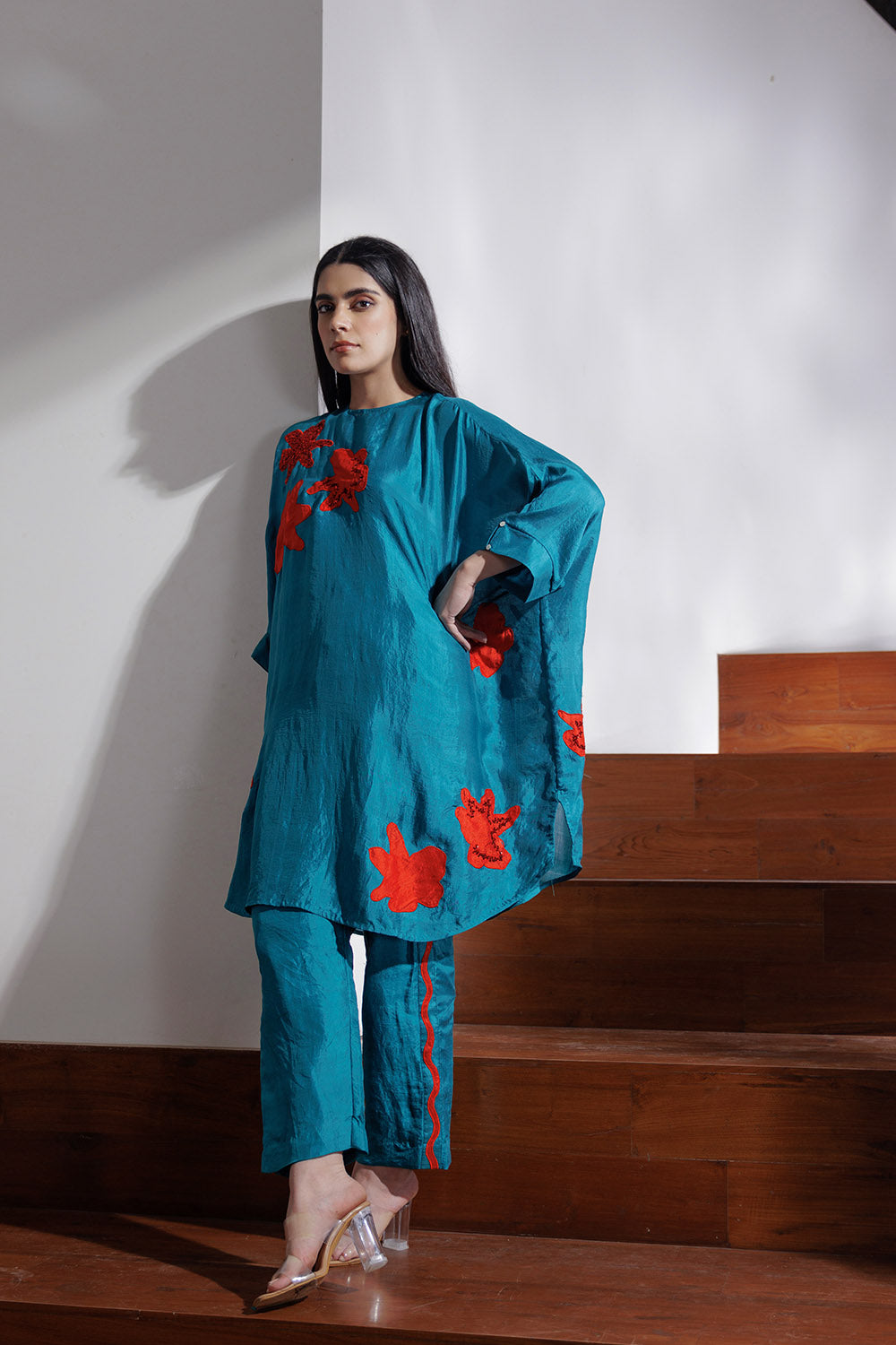 Teal handwoven mulberry silk free size tunic with contrast red applique motifs. Some motifs are embellished with sequins.