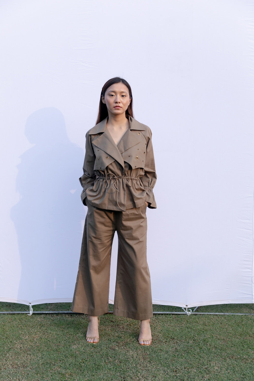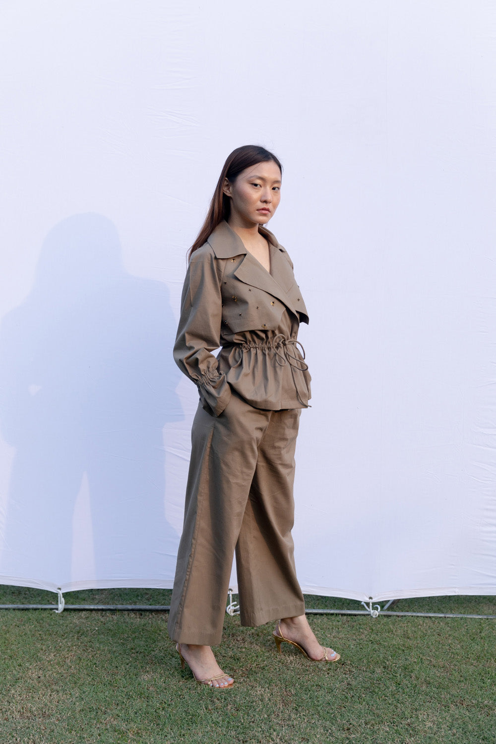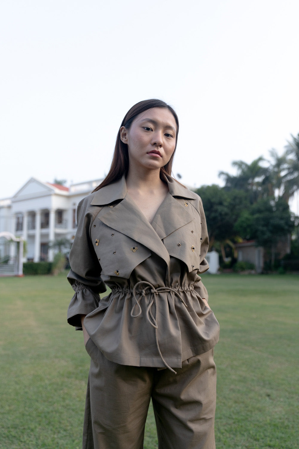 Draw-string waist jacket and culotte set with metal bead embroidery