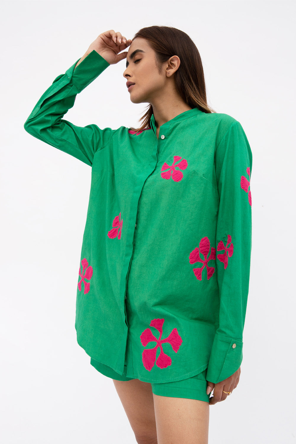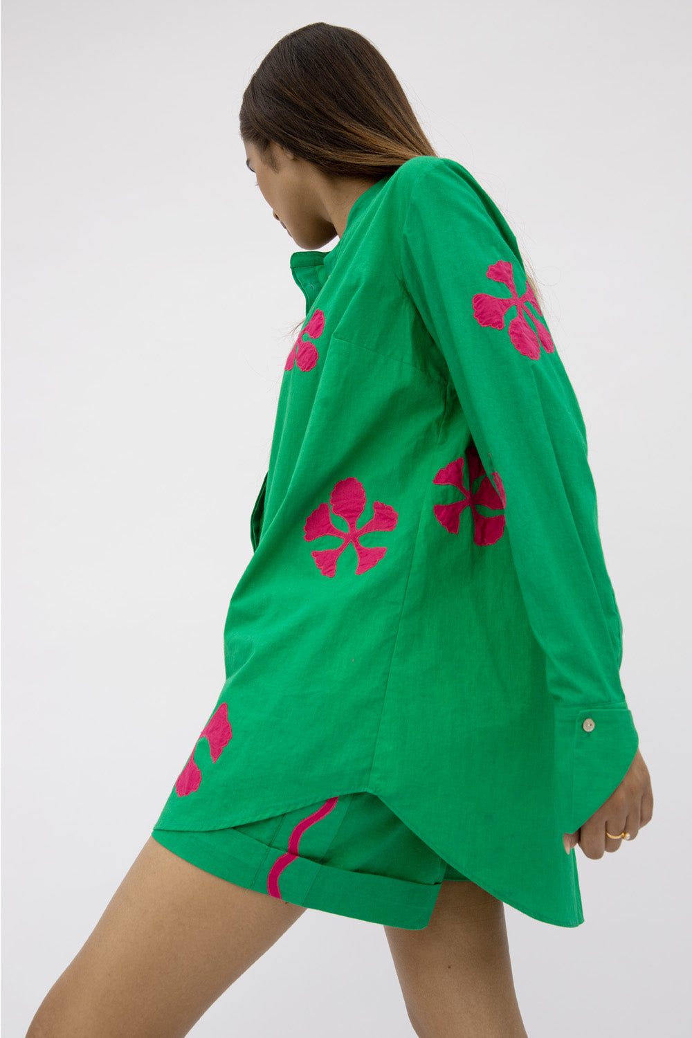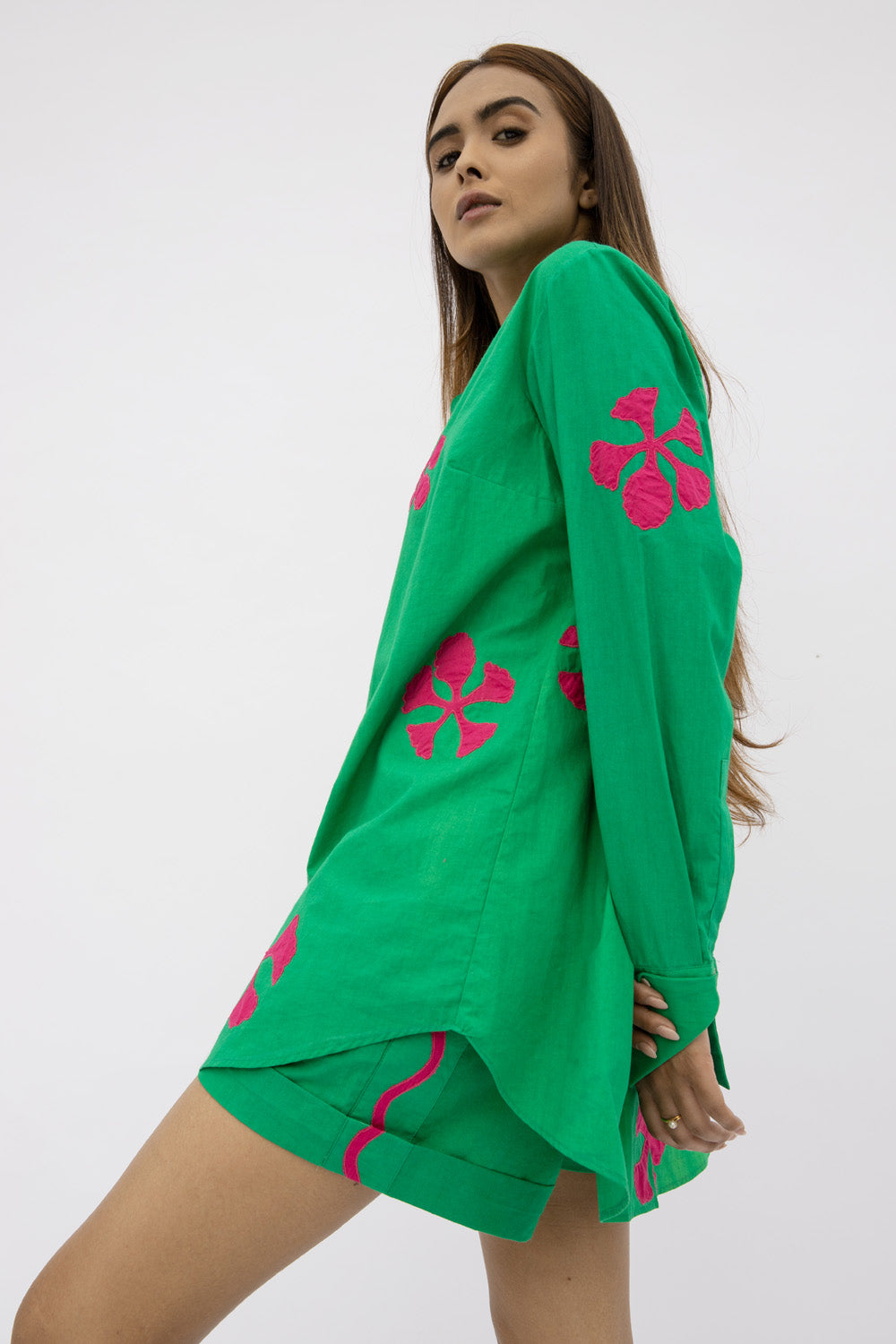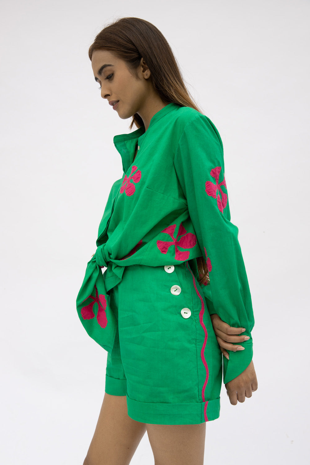 Slim fit shirt and high waisted shorts co-ord set with contrast flower applique. 100% Cotton