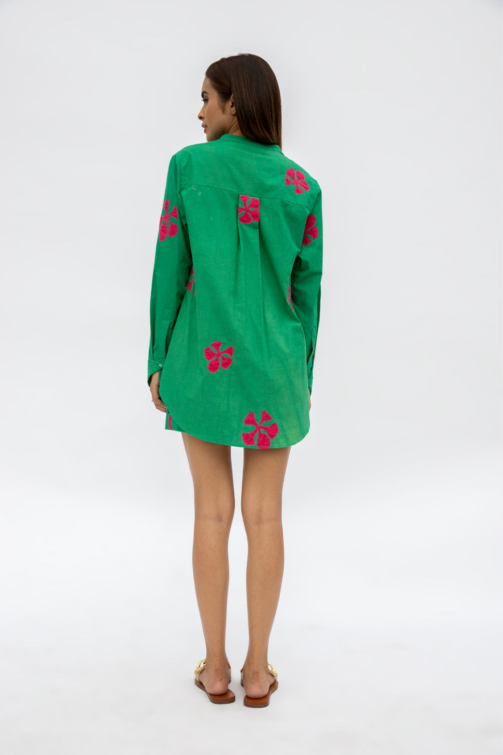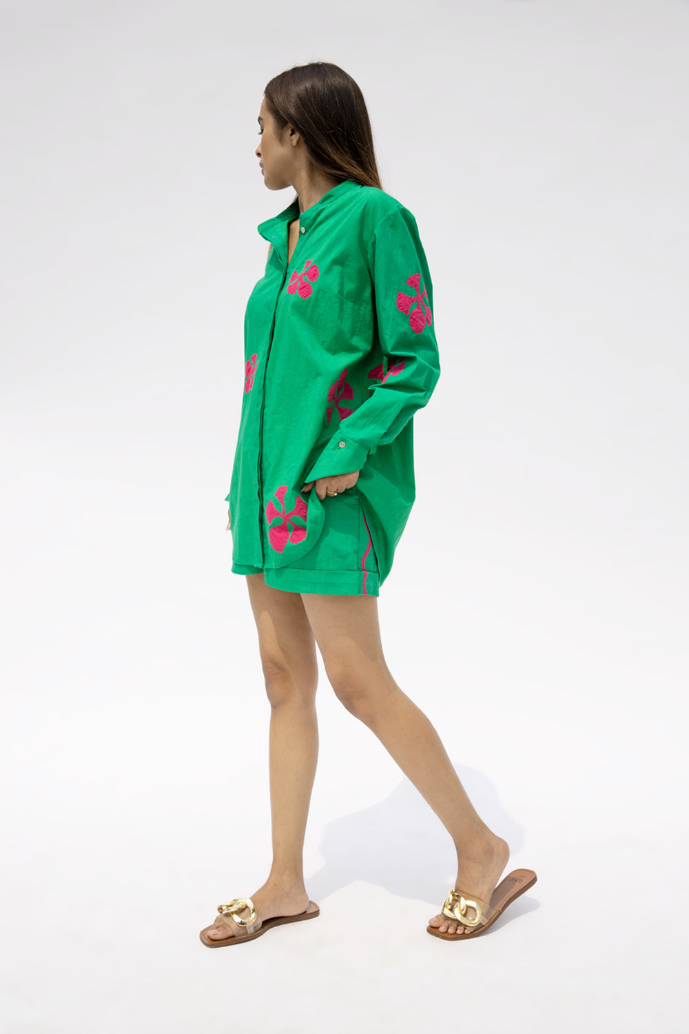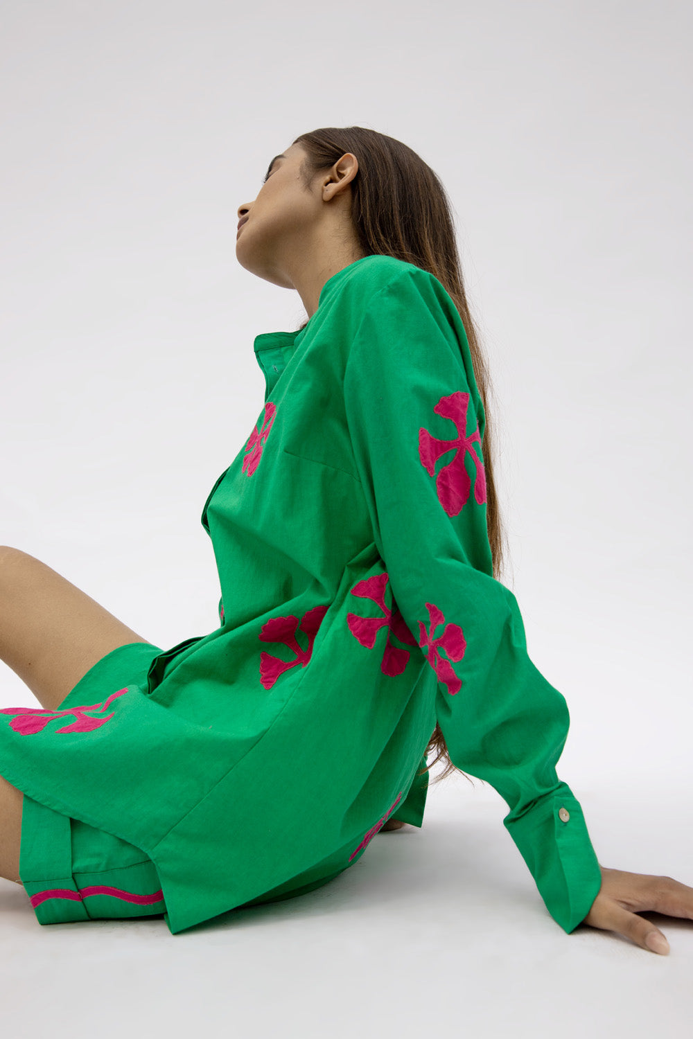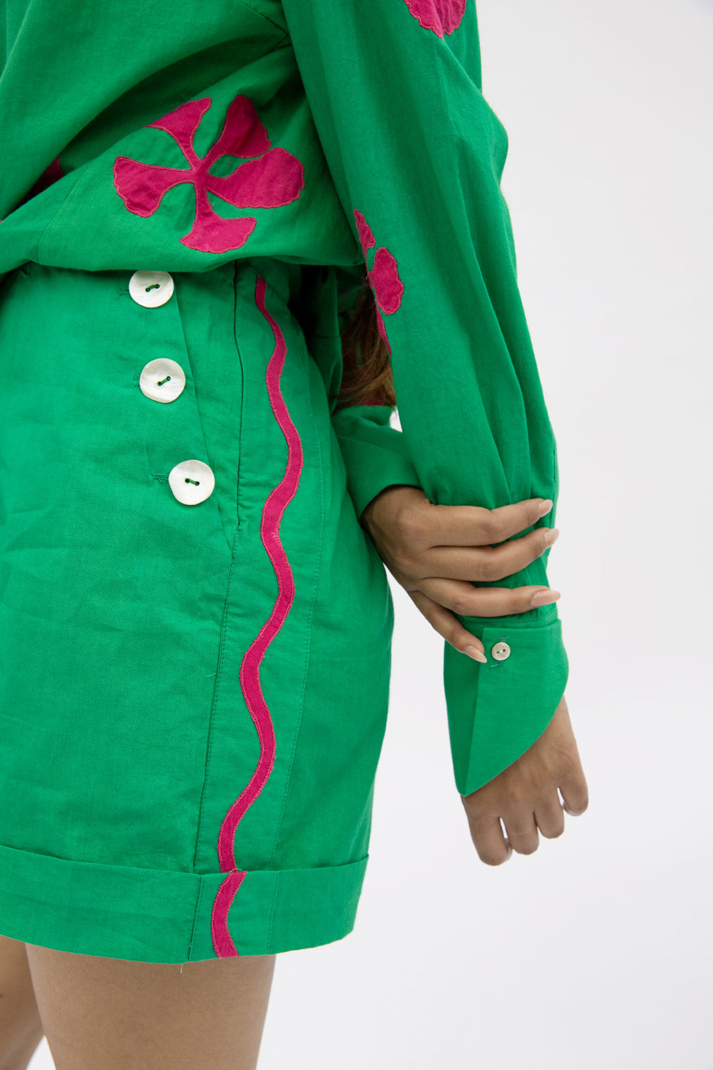 Slim fit shirt and high waisted shorts co-ord set with contrast flower applique. 100% Cotton