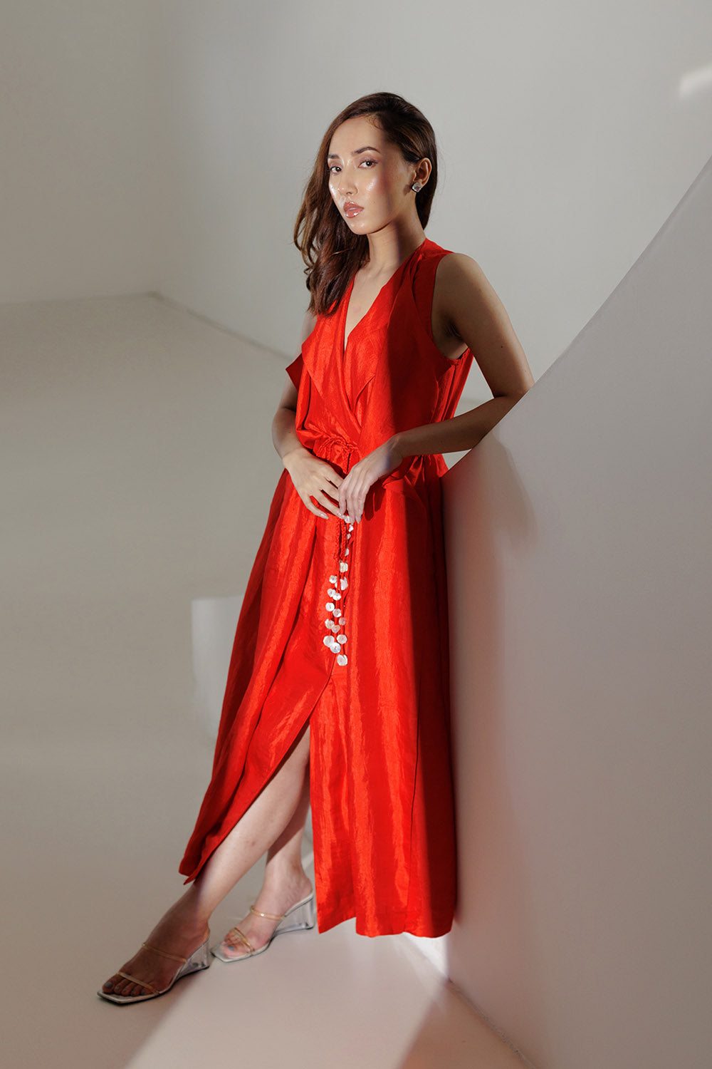 Red handwoven mulberry silk trench style dress with a braided cord belt embellished with mother of pearl shell buttons.