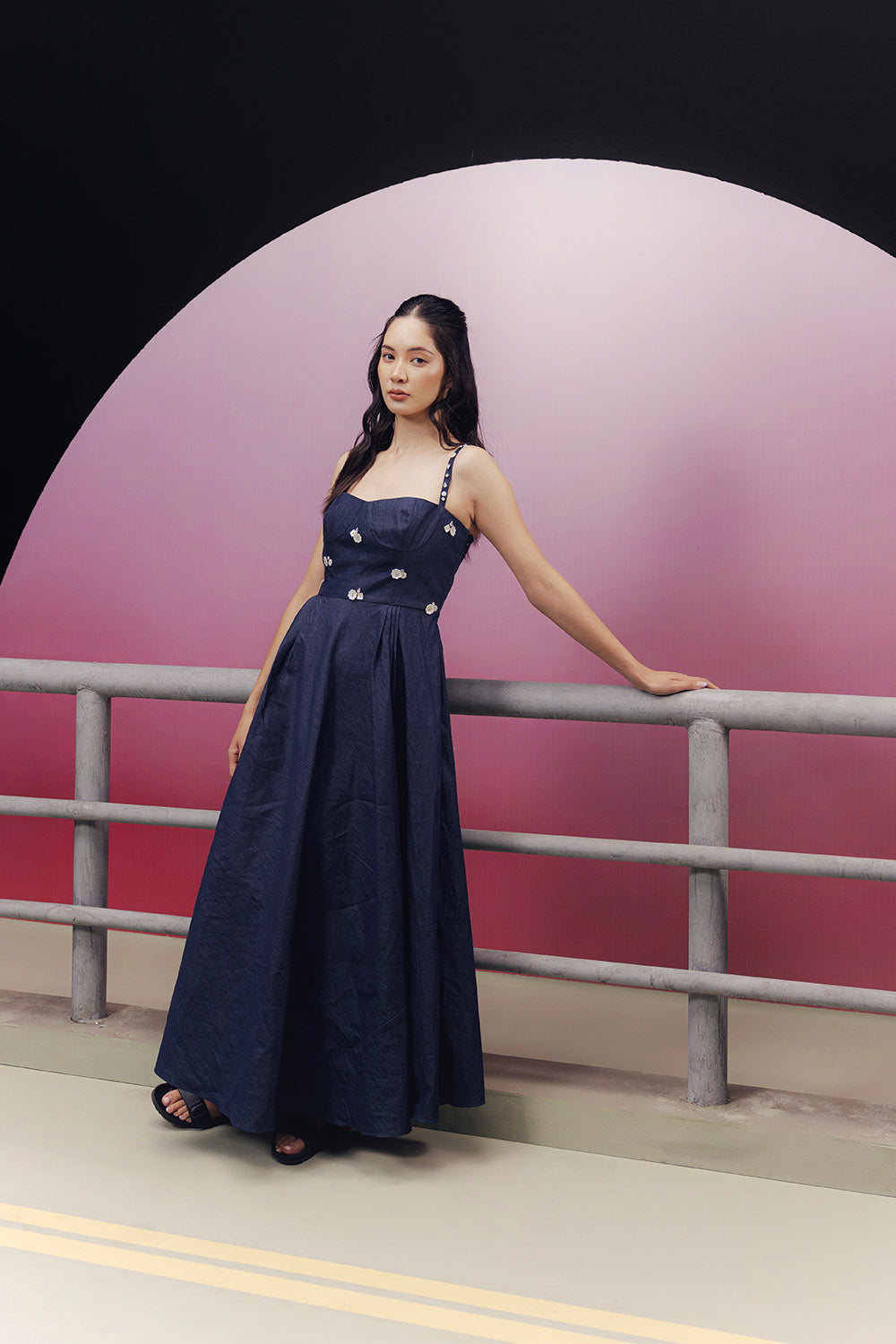 Indigo denim corset style midi dress with shell and diamonte work on the bodice.