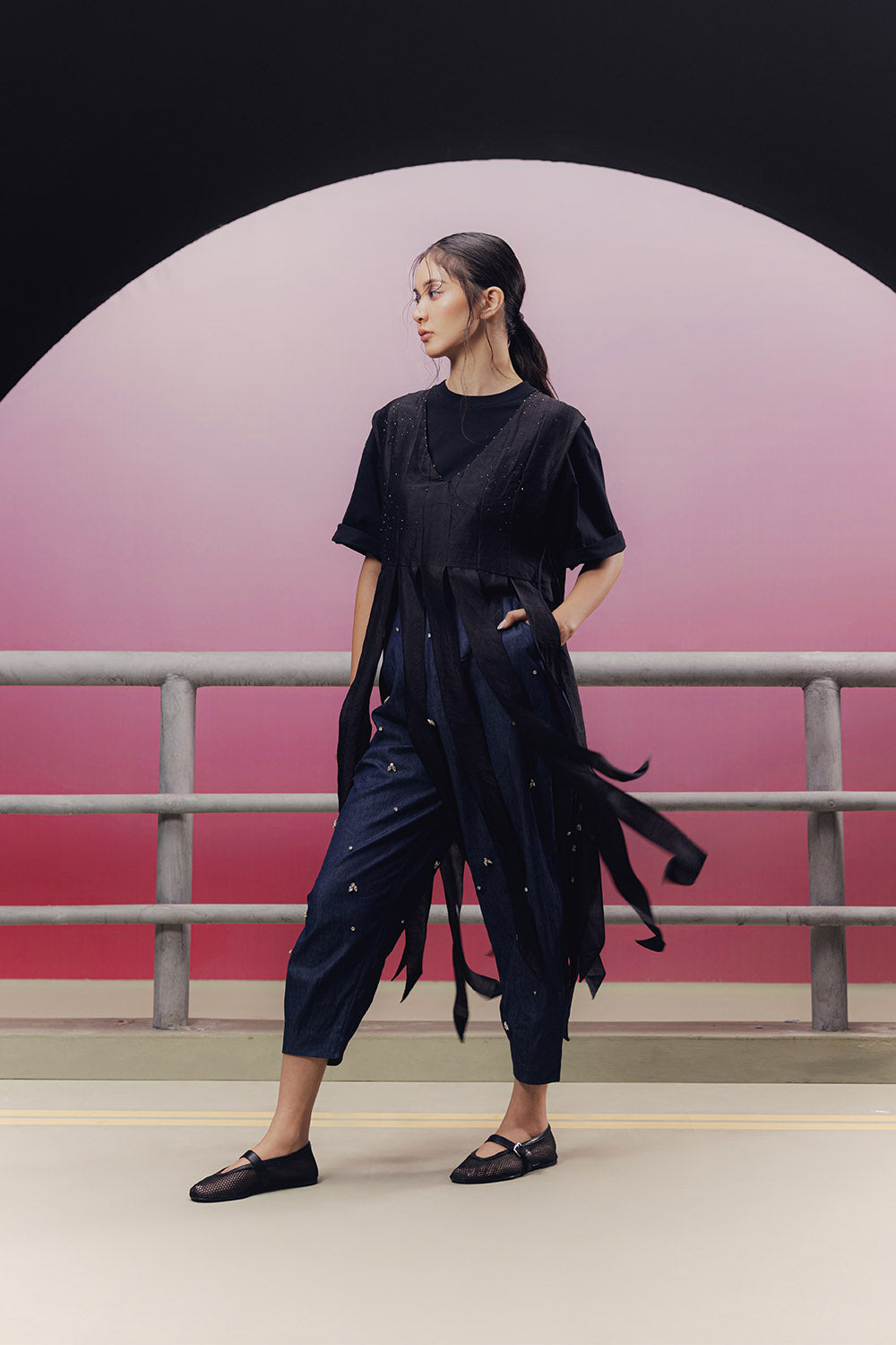 Indigo-denim carrot fit pants with scattered diamonte embroidery