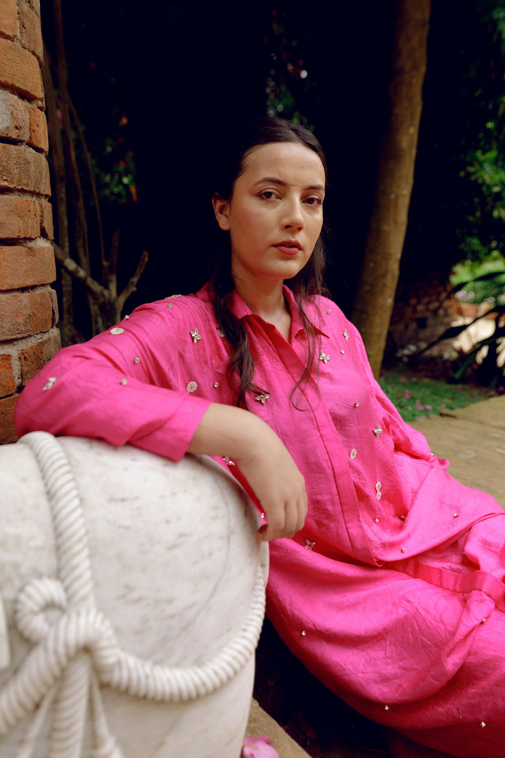 Pink handwoven mulberry silk shirt dress with all over Mother of Pearl and rhinestone embroidery.