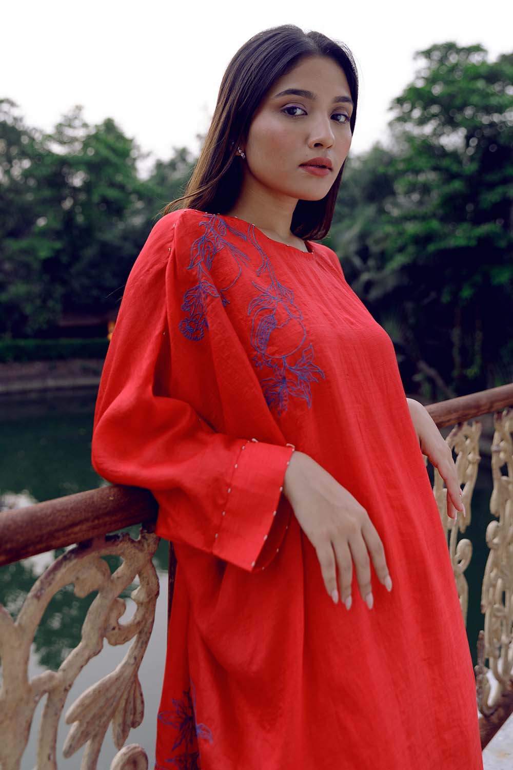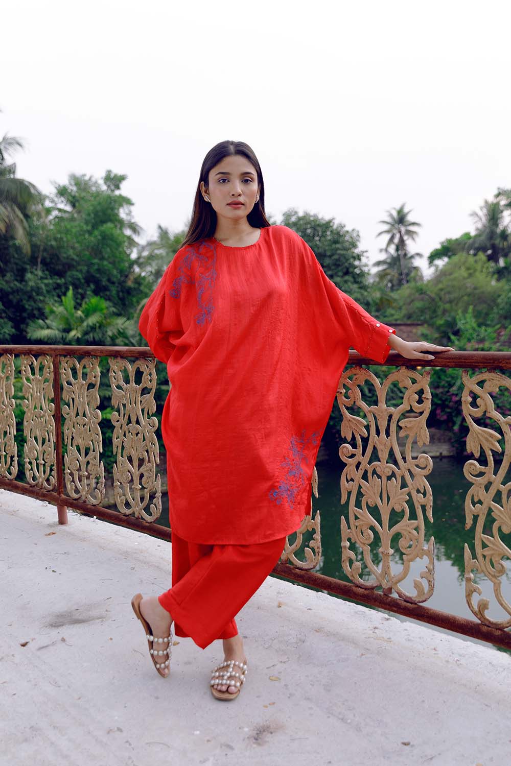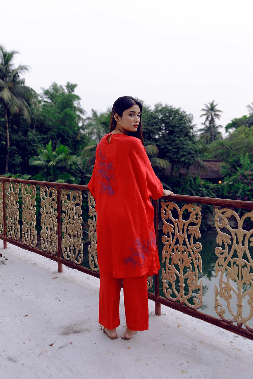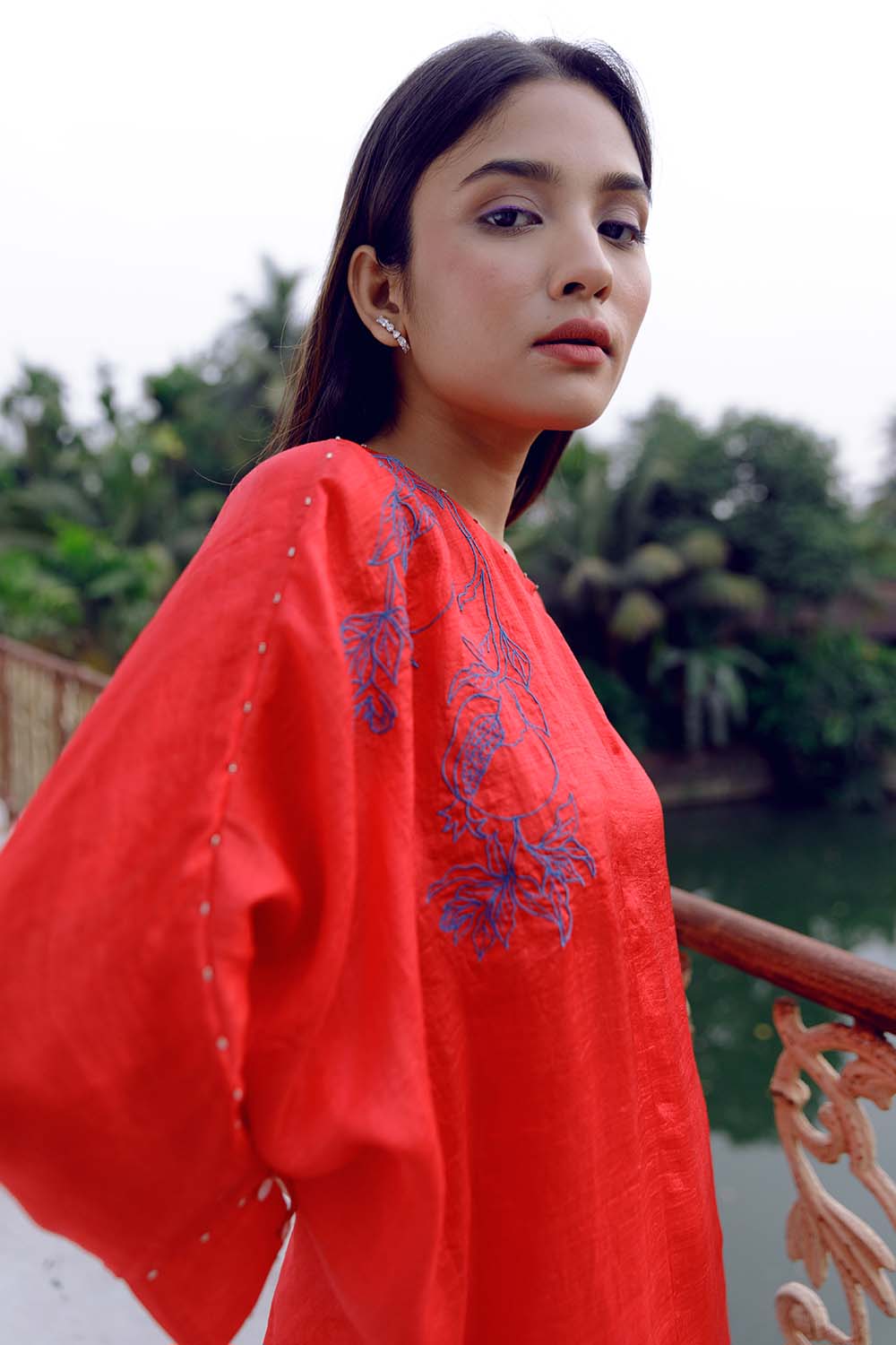 Red handwoven mulberry silk free size tunic with contrast blue pomegranate motif embroidery and bead work on the shoulder and neck. Paired with straight cut trouser.