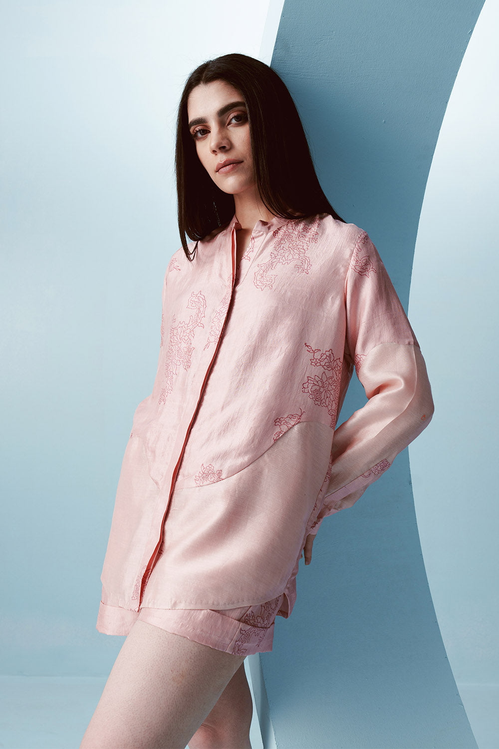 Relaxed fit block printed crepe shirt with an abstract sheer chanderi panel paired with high waist comfortable elasticated printed shorts.