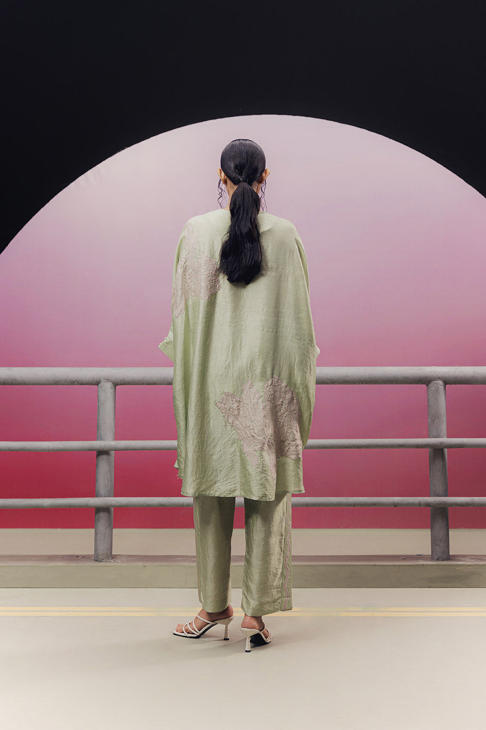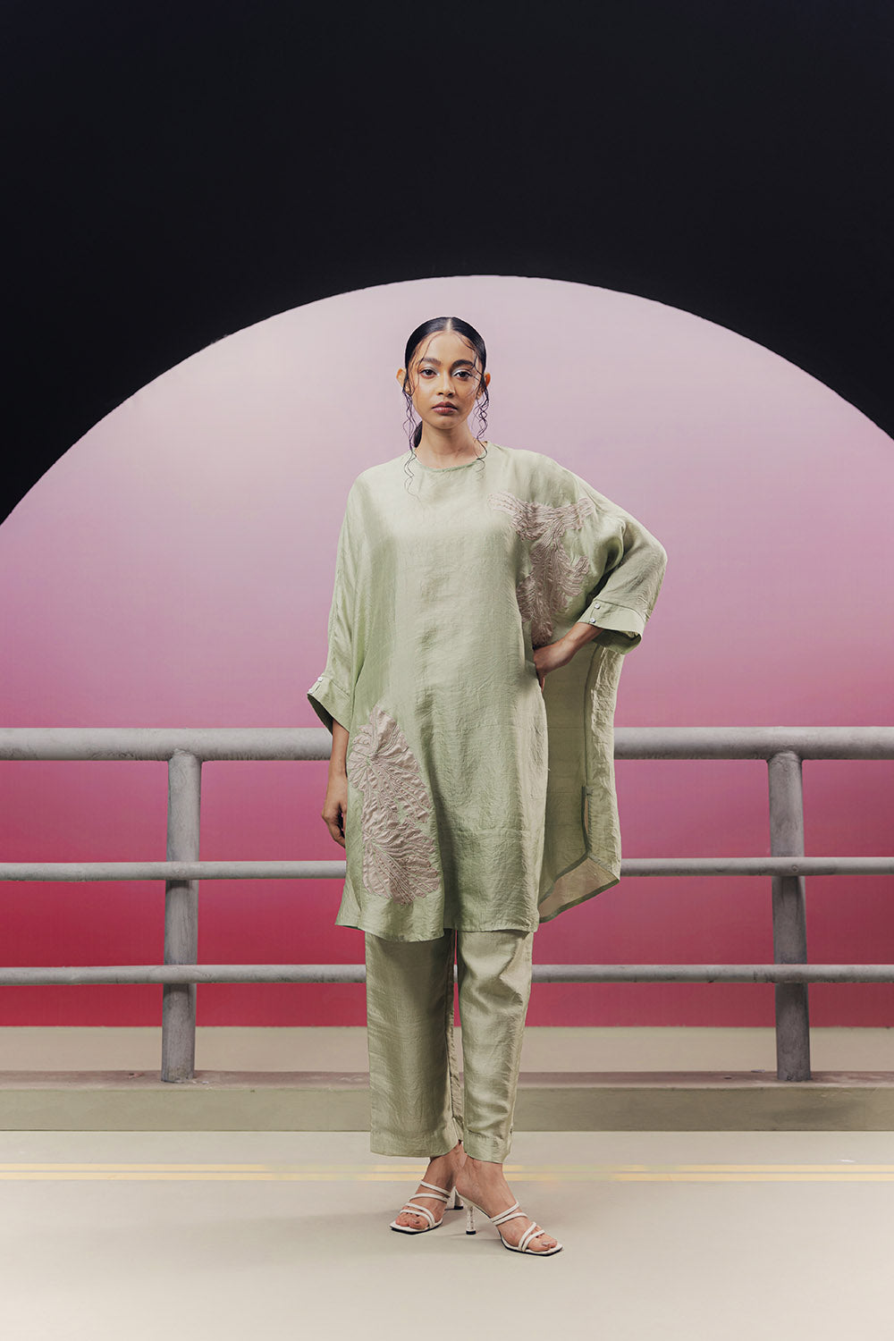 Handwoven silk free-size tunic co-ord set with applique on the tunic and the pant borders. The applique is highlighted with bead work.