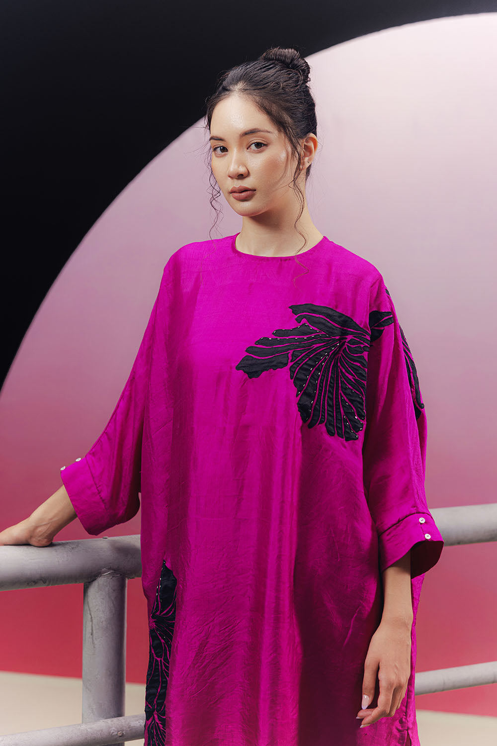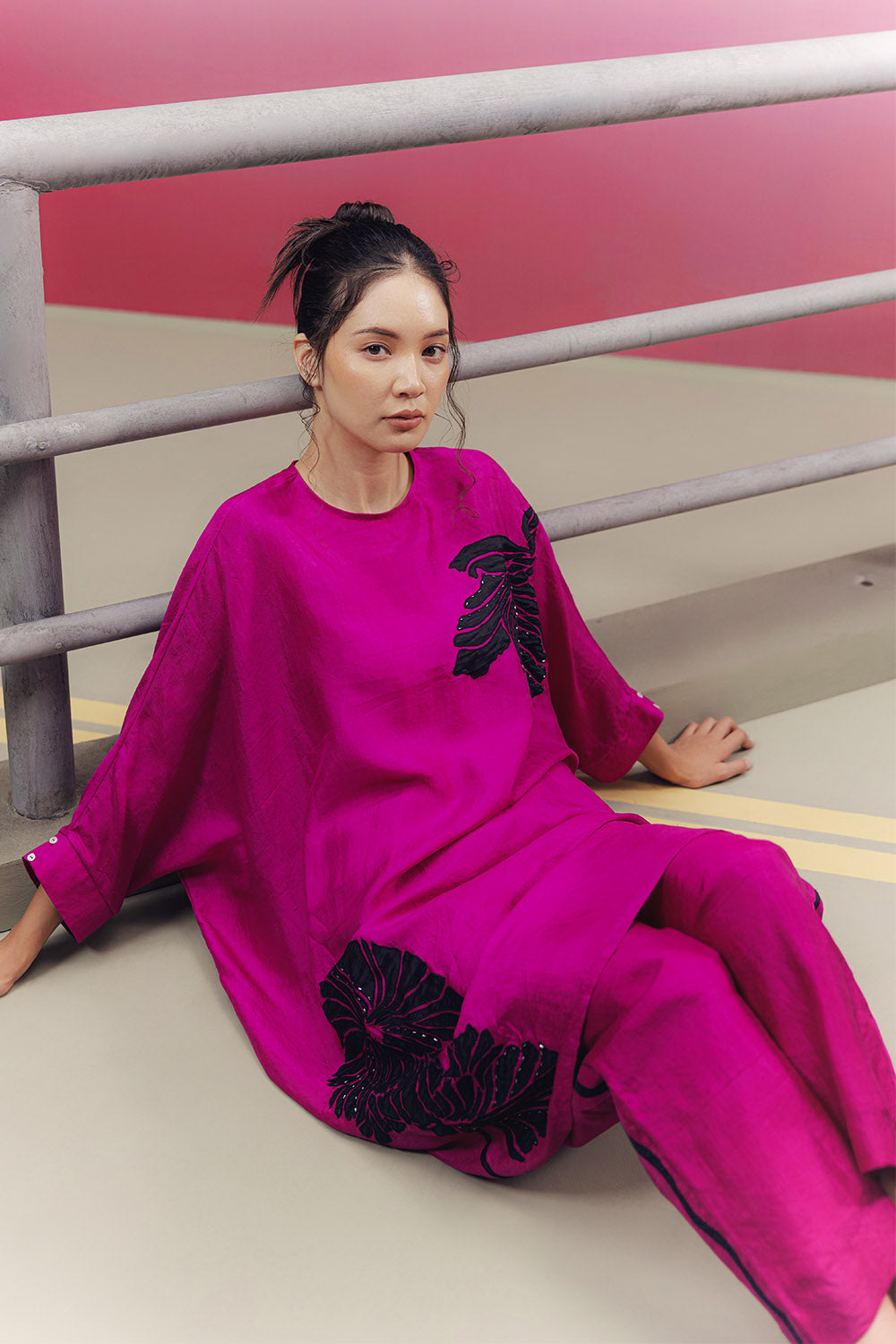 Handwoven silk free-size tunic co-ord set with applique on the tunic and the pant borders. The applique is highlighted with bead work.