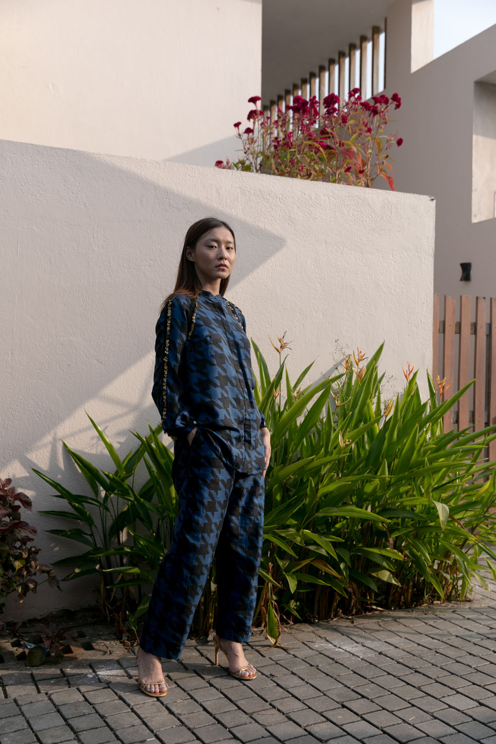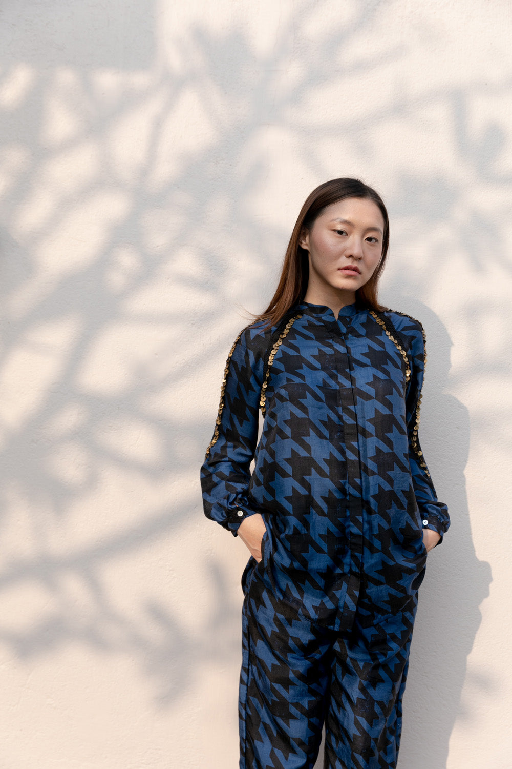 Block printed handwoven silk co-ord set with metal sequin edging detail on the shirt