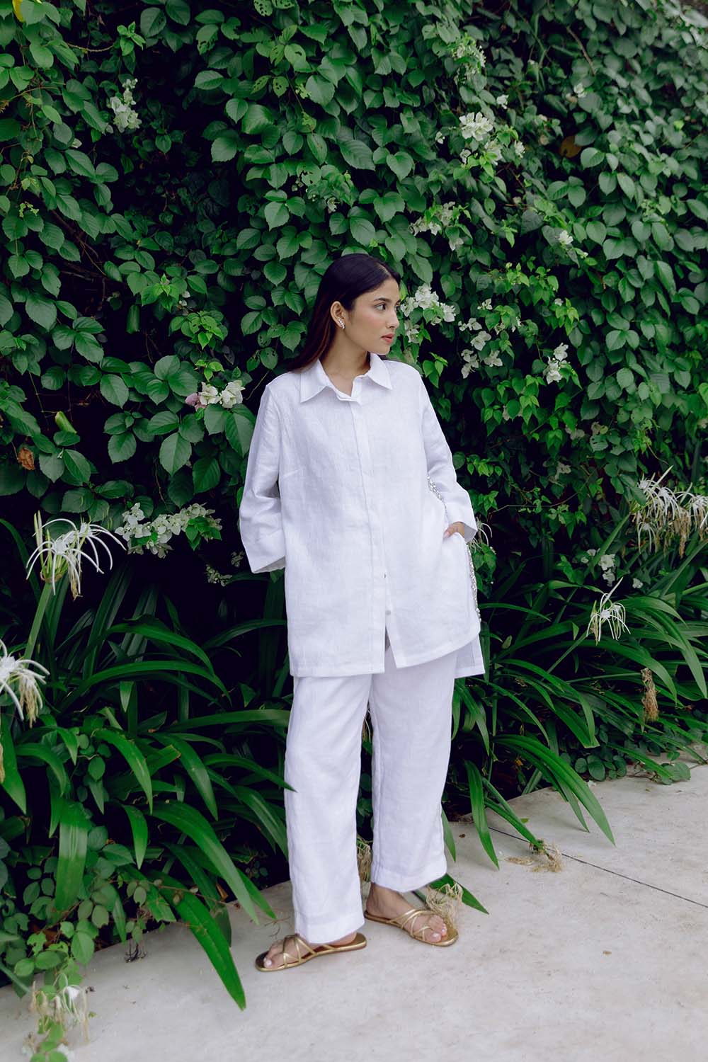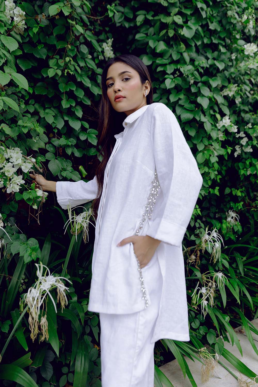 A white linen boxy fit shirt with a high embellished side slit and longer back. Paired with relaxed cropped white linen trouser.
