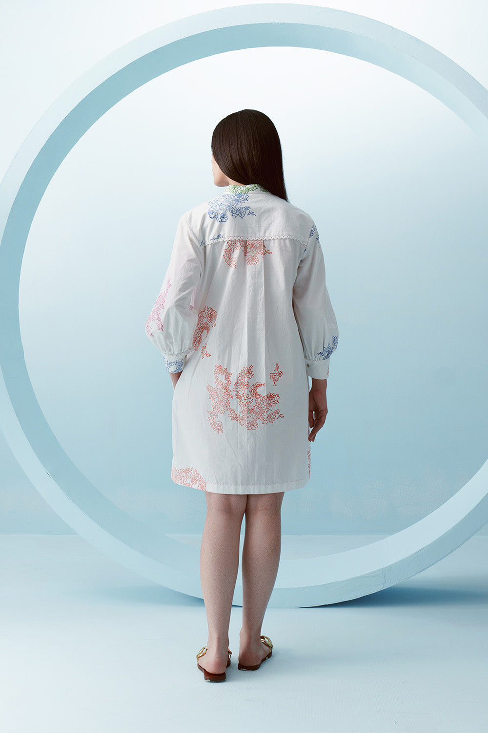 Block printed comfortable shirt, with a front and back placket and lace trim edging. The shirt is styled with the same printed skort.