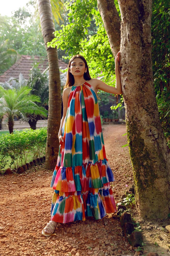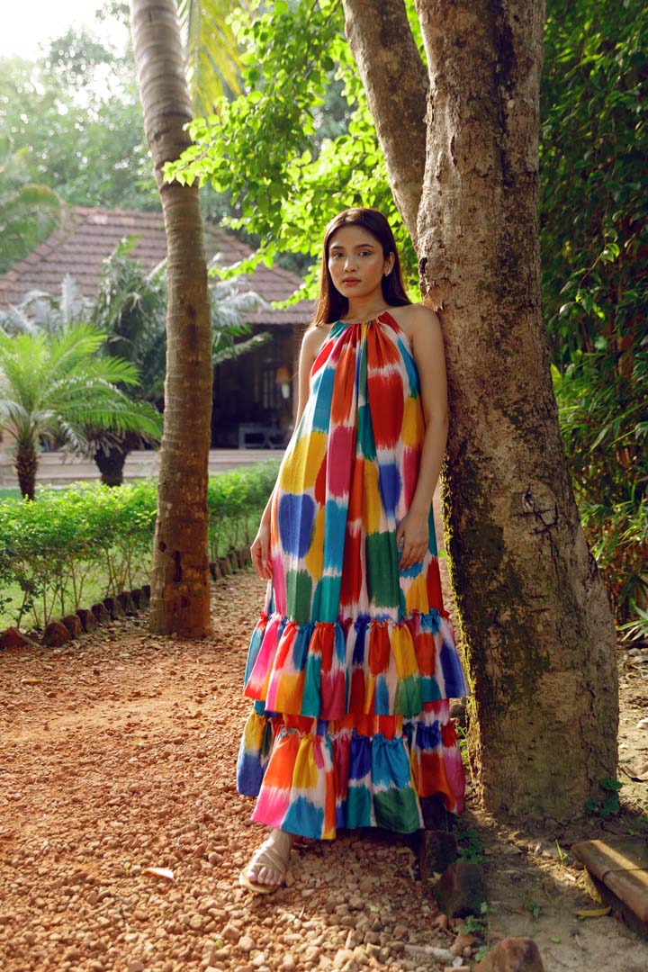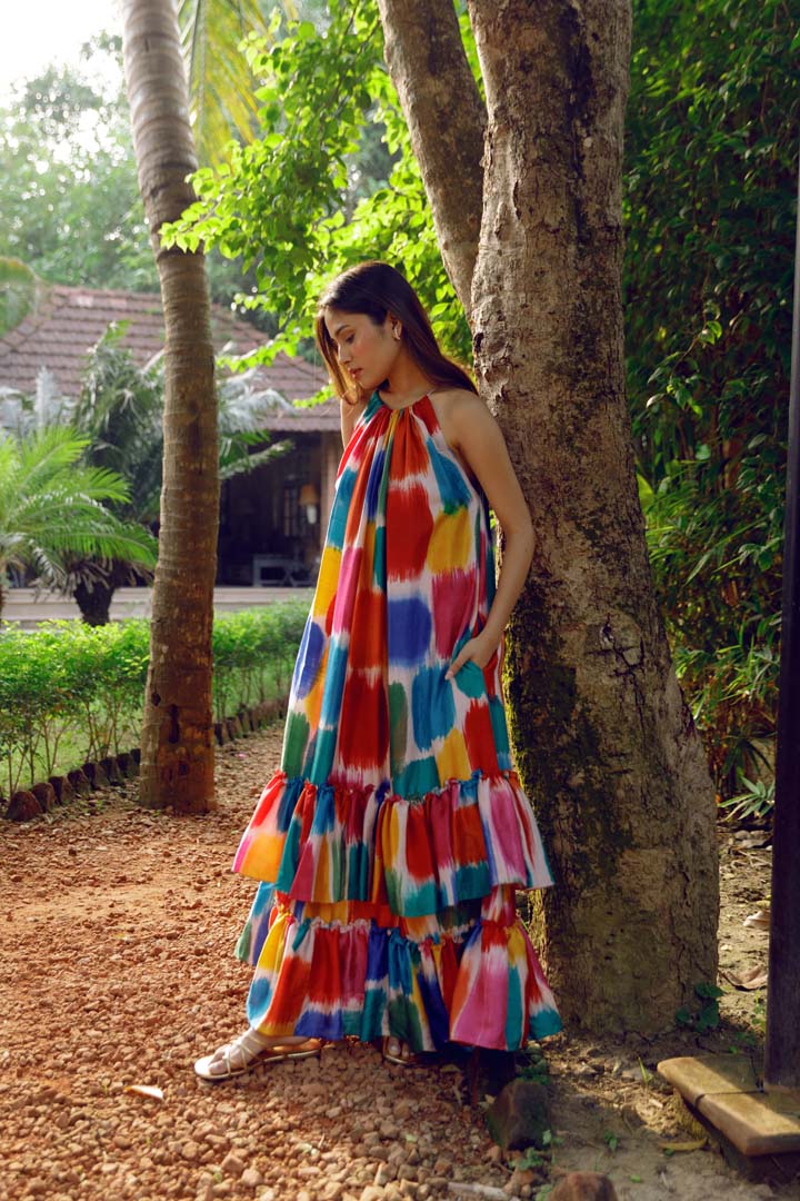 Multicolour brush stroke print, handwoven mulberry silk ruffled hem strappy midi dress with a back tie shell button detail. It also has pockets on each side.