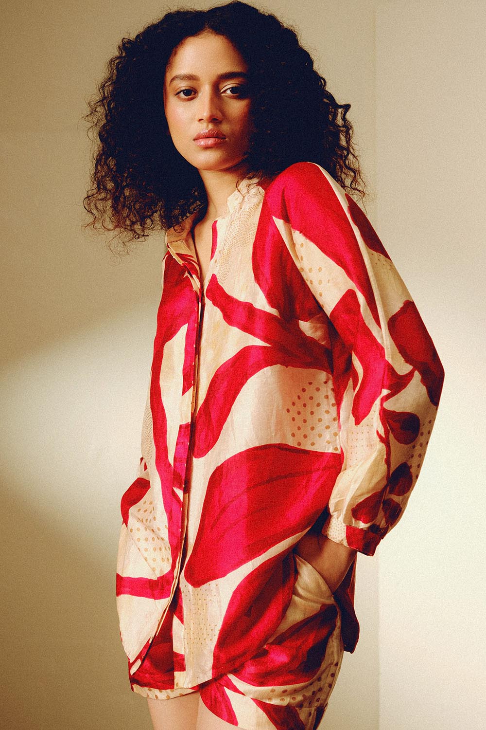 Handwoven and hand-painted mulberry silk shirt with chinese collar and raglan sleeves, Finished with bead edging.
