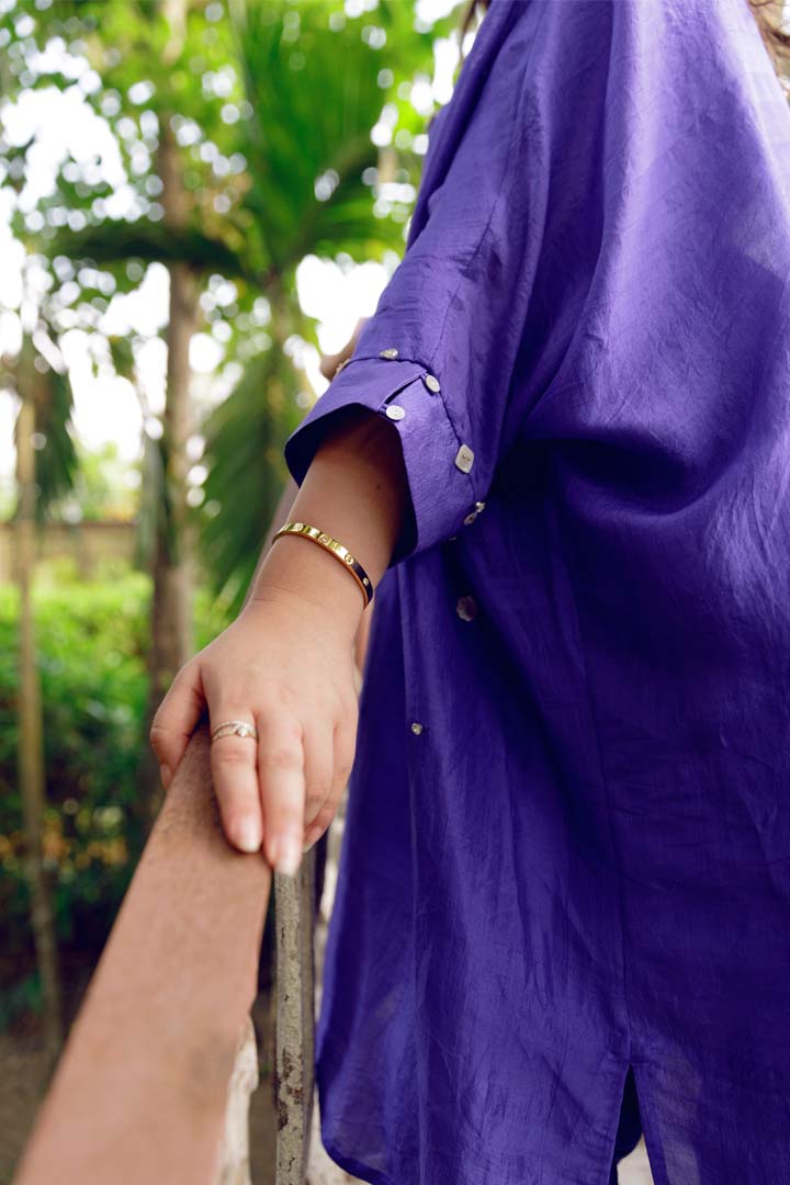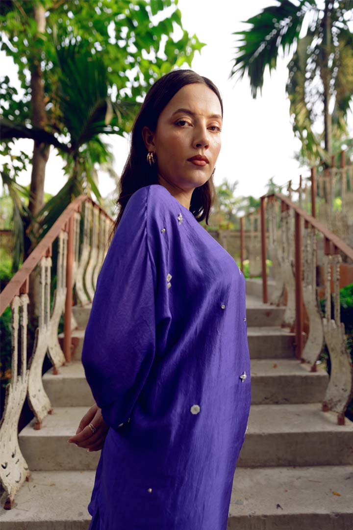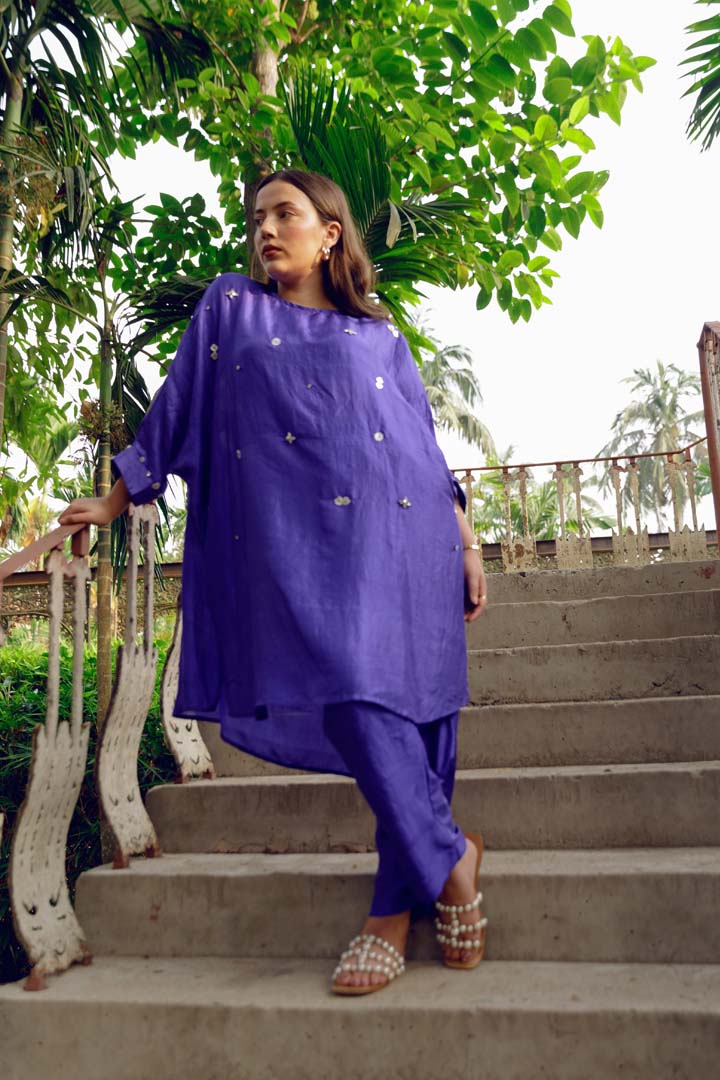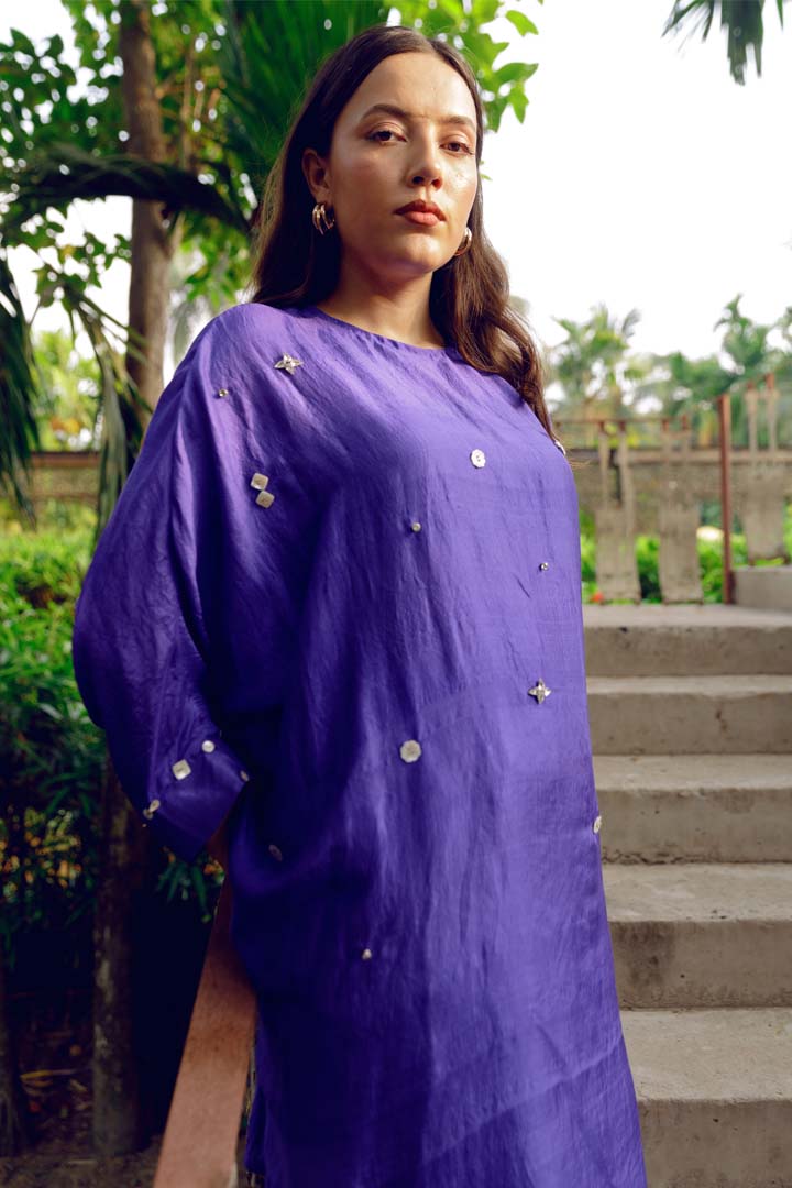 Purple coloured handwoven mulberry silk free size tunic, with all over Mother of Pearl and crystal embroidery. Paired with straight comfortable trouser.