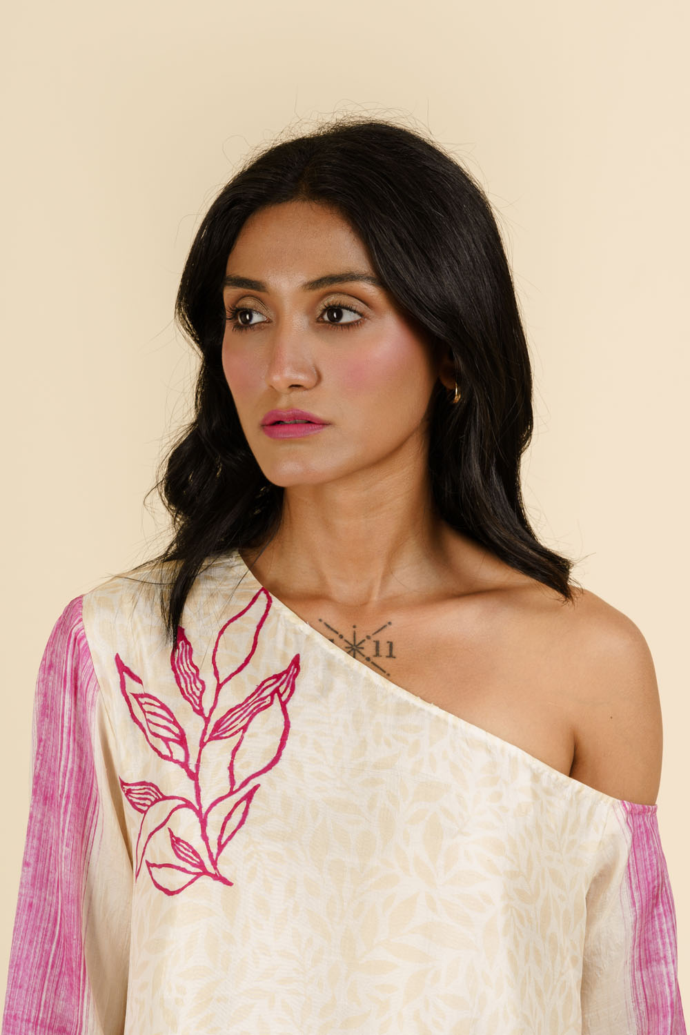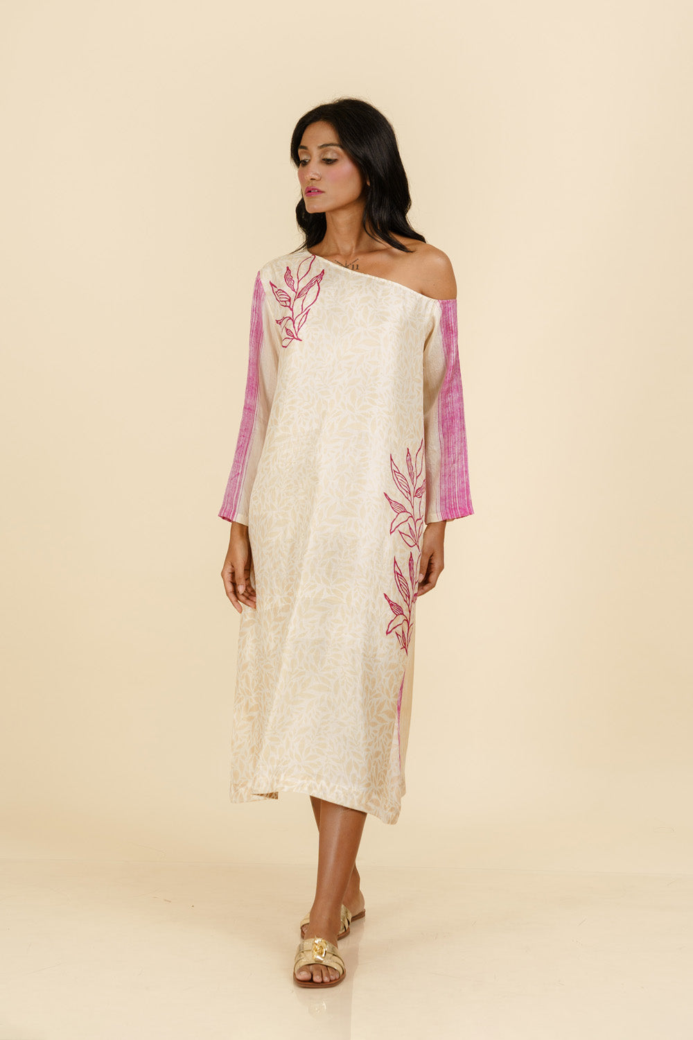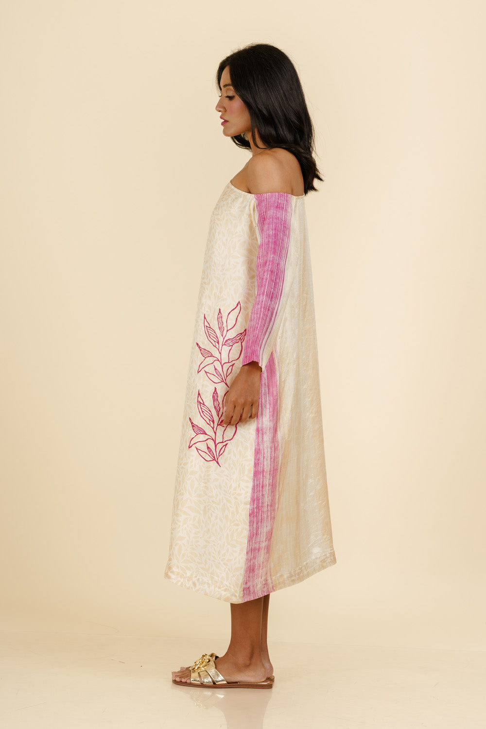 Handwoven Mulberry silk, block printed and hand painted midi off shoulder dress