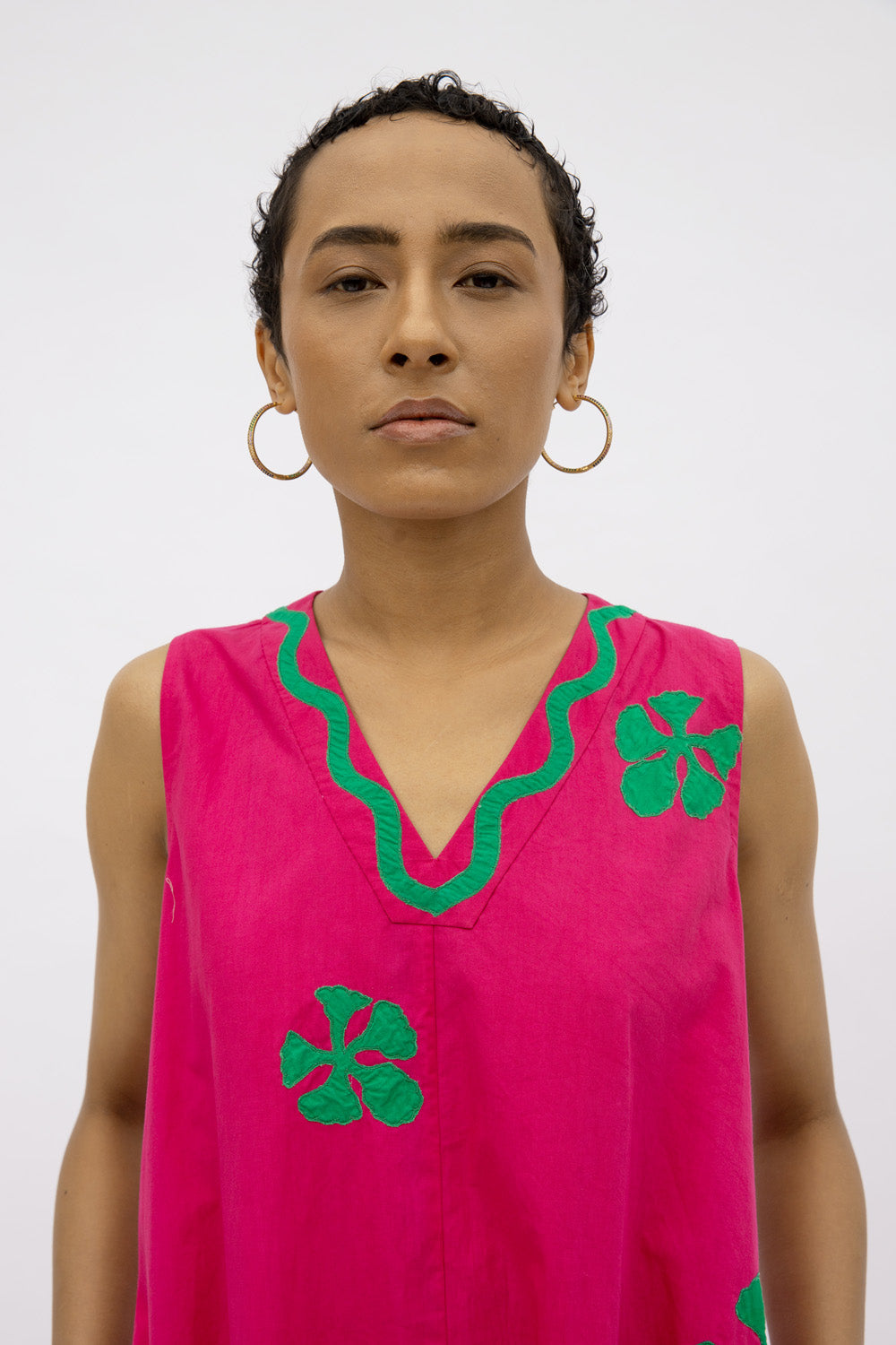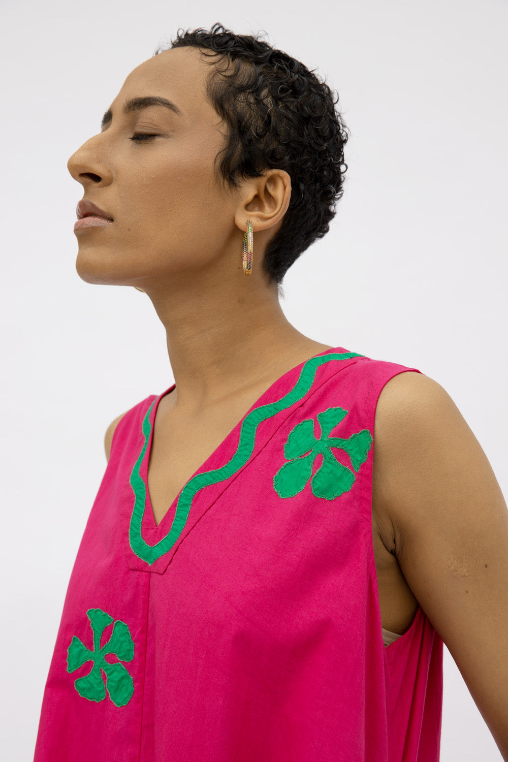 V Neck long sleeveless dress with floral and neck applique details. 100% Cotton