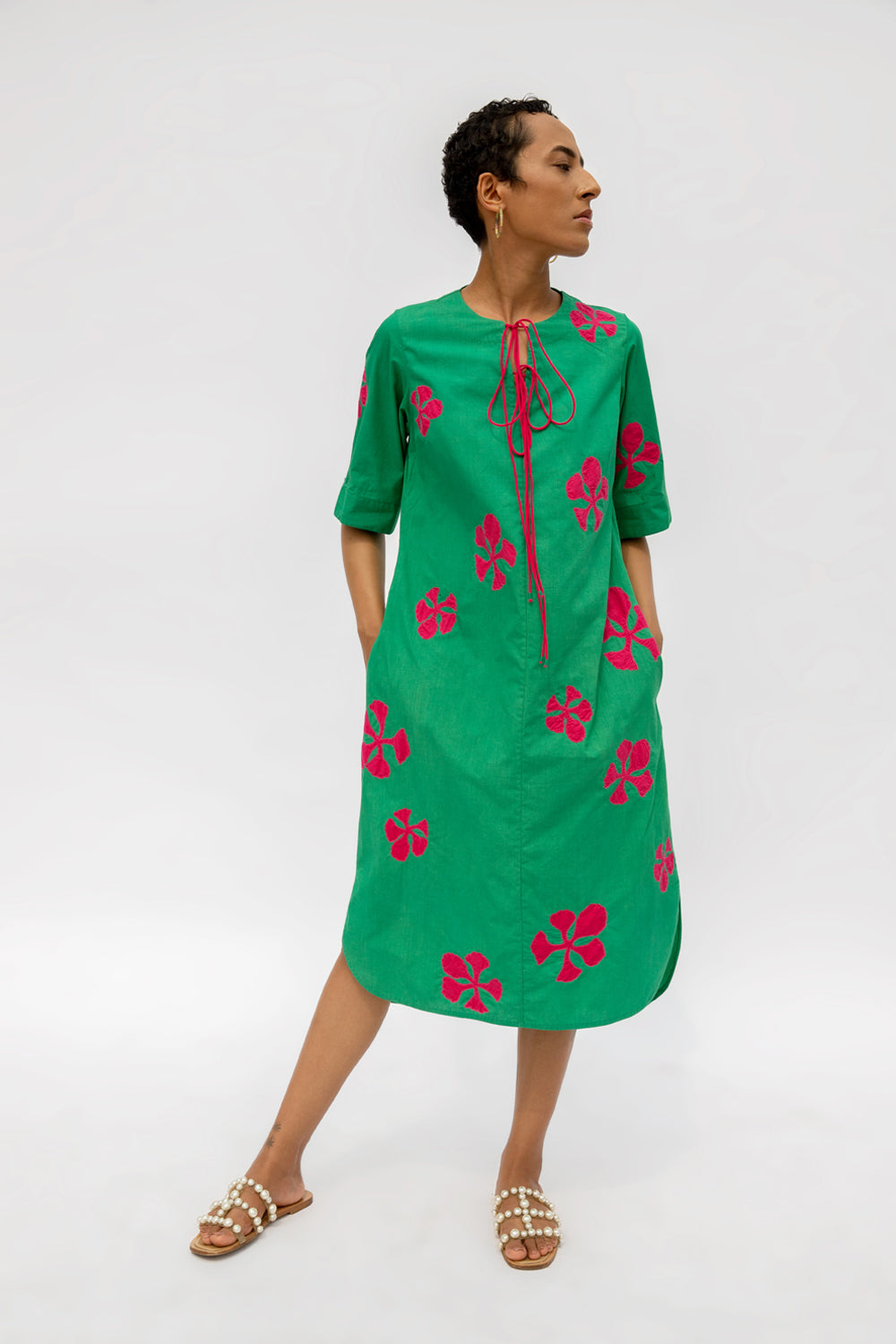 Straight cut tunic dress with applique and contrast cord details. 100% Cotton