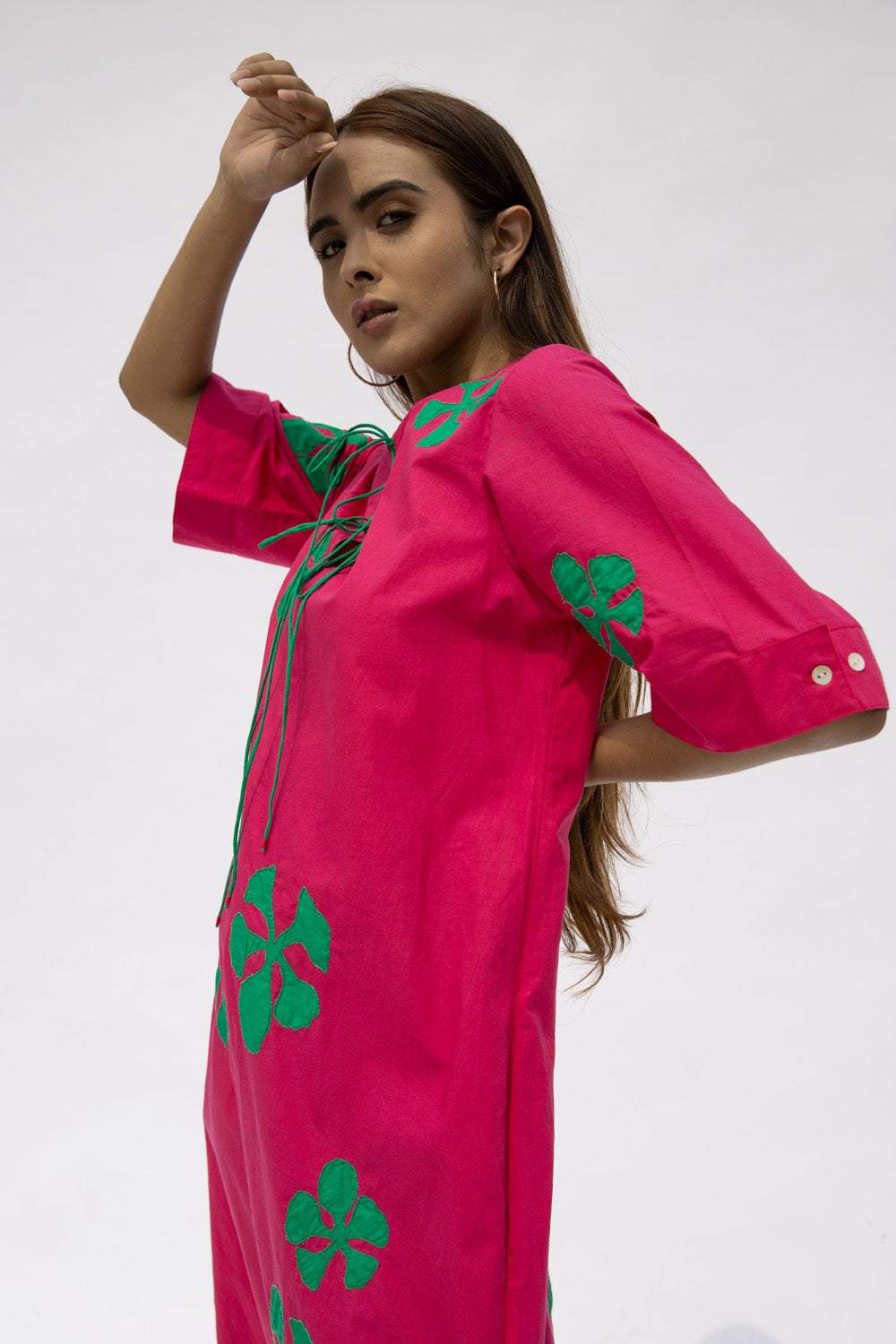 Straight cut tunic dress with applique and contrast cord details. 100% Cotton