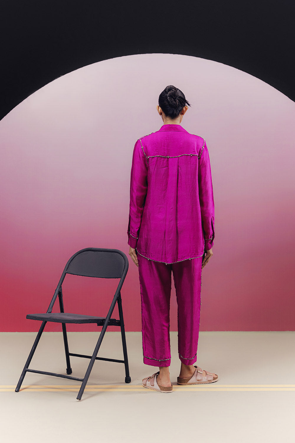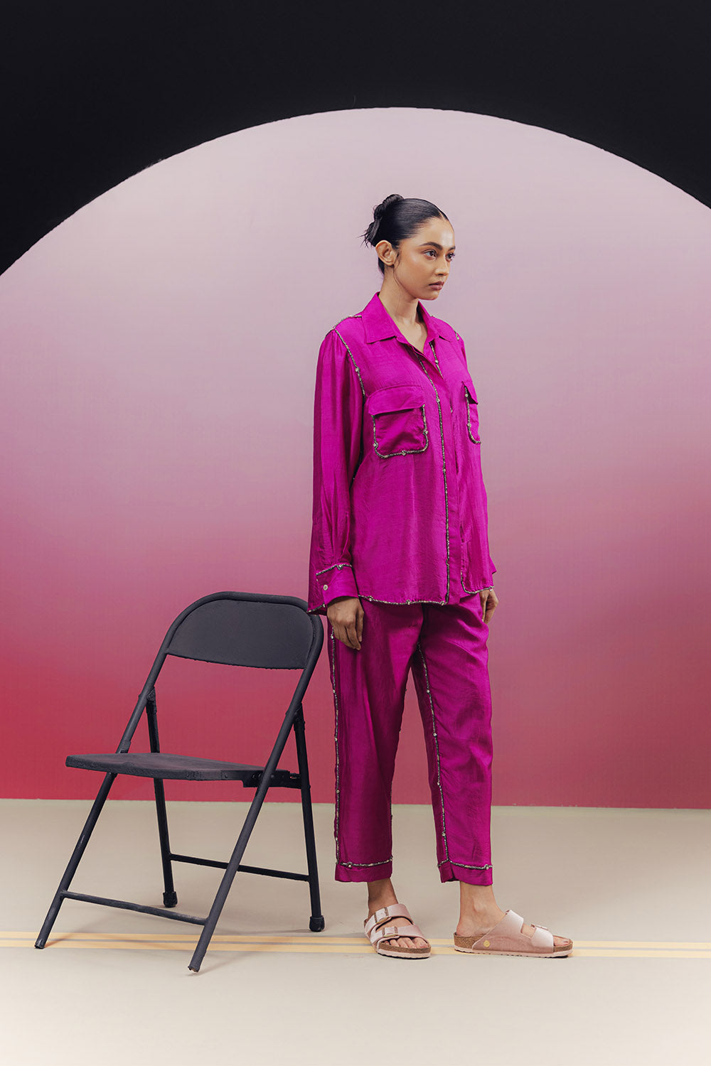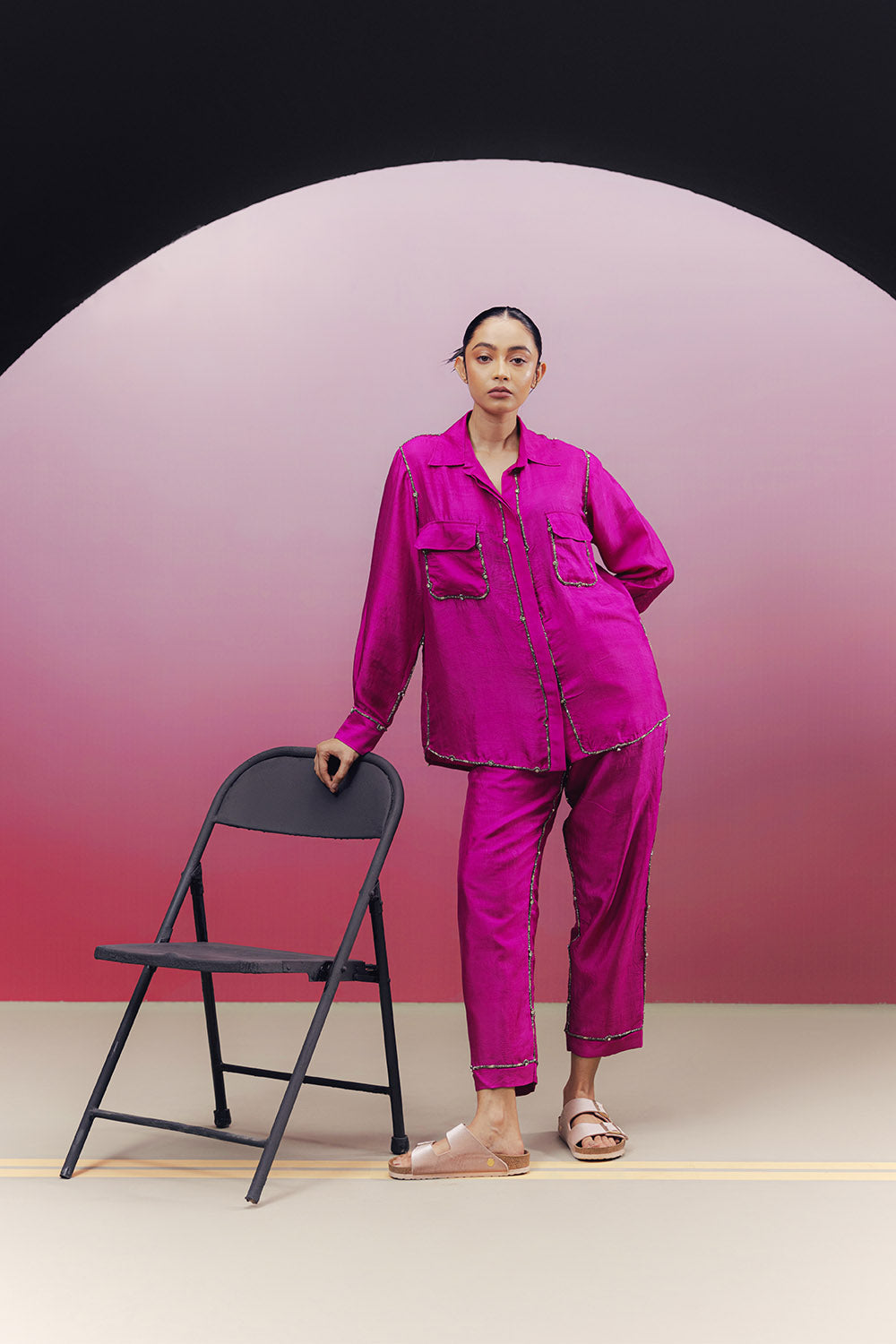Handwoven silk co-ord set with embroidered bead work along the seams and flap pocket details on the shirt.