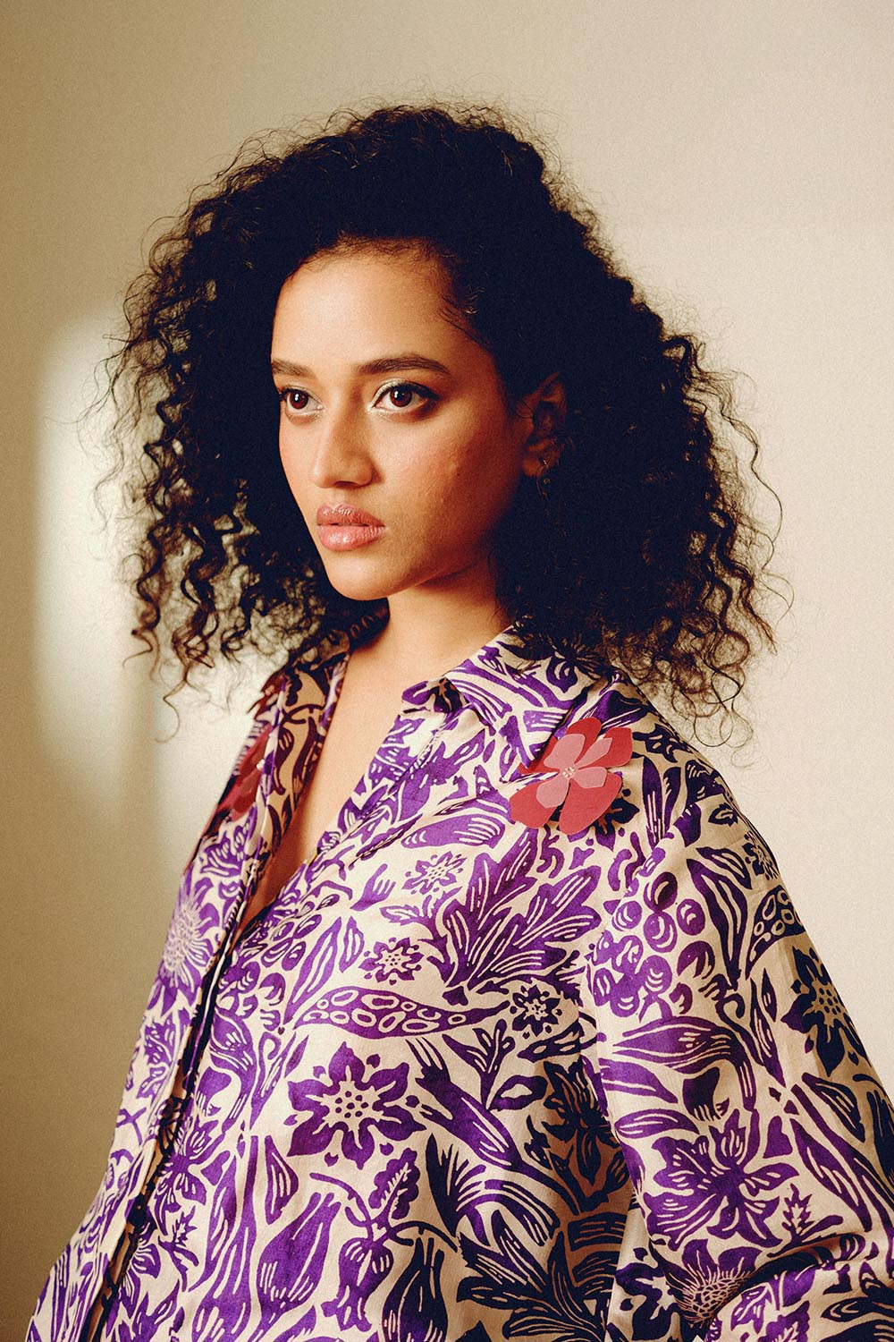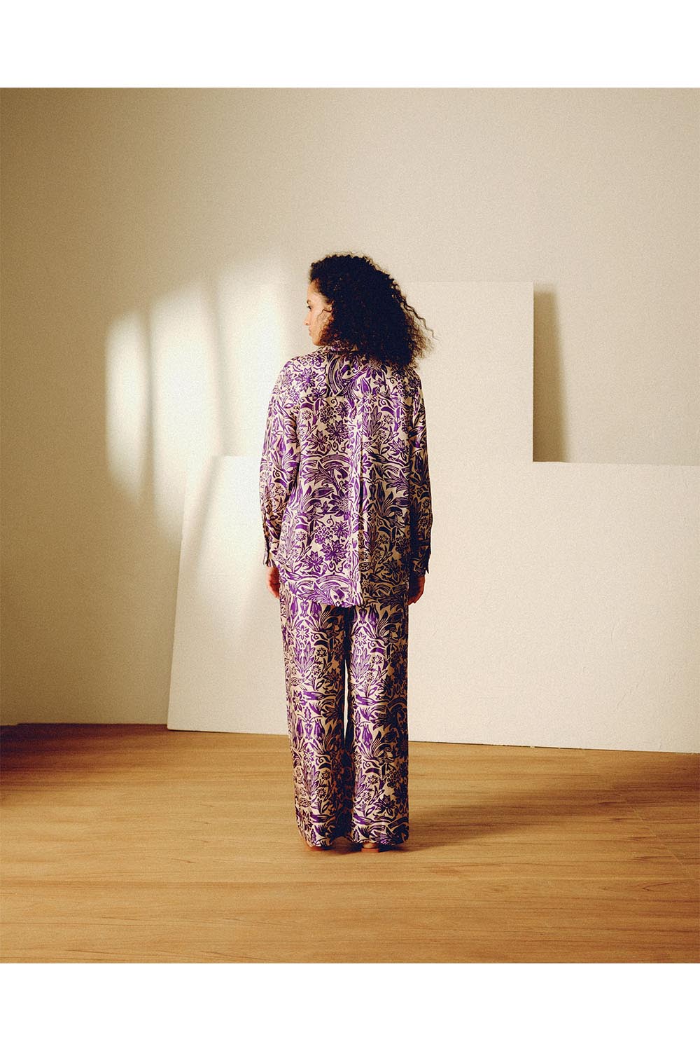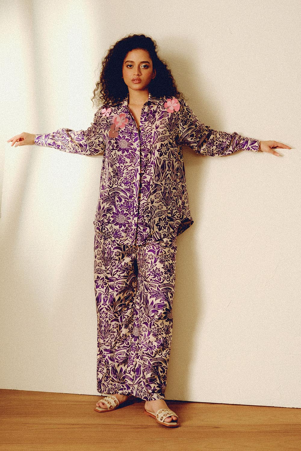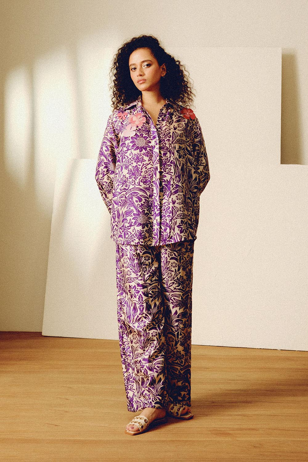 Handwoven and block printed mulberry silk relaxed fit shirt and trousers with handcut floral sustainable sequin embroidery. This shirt is styled with high waisted solid relaxed shorts.