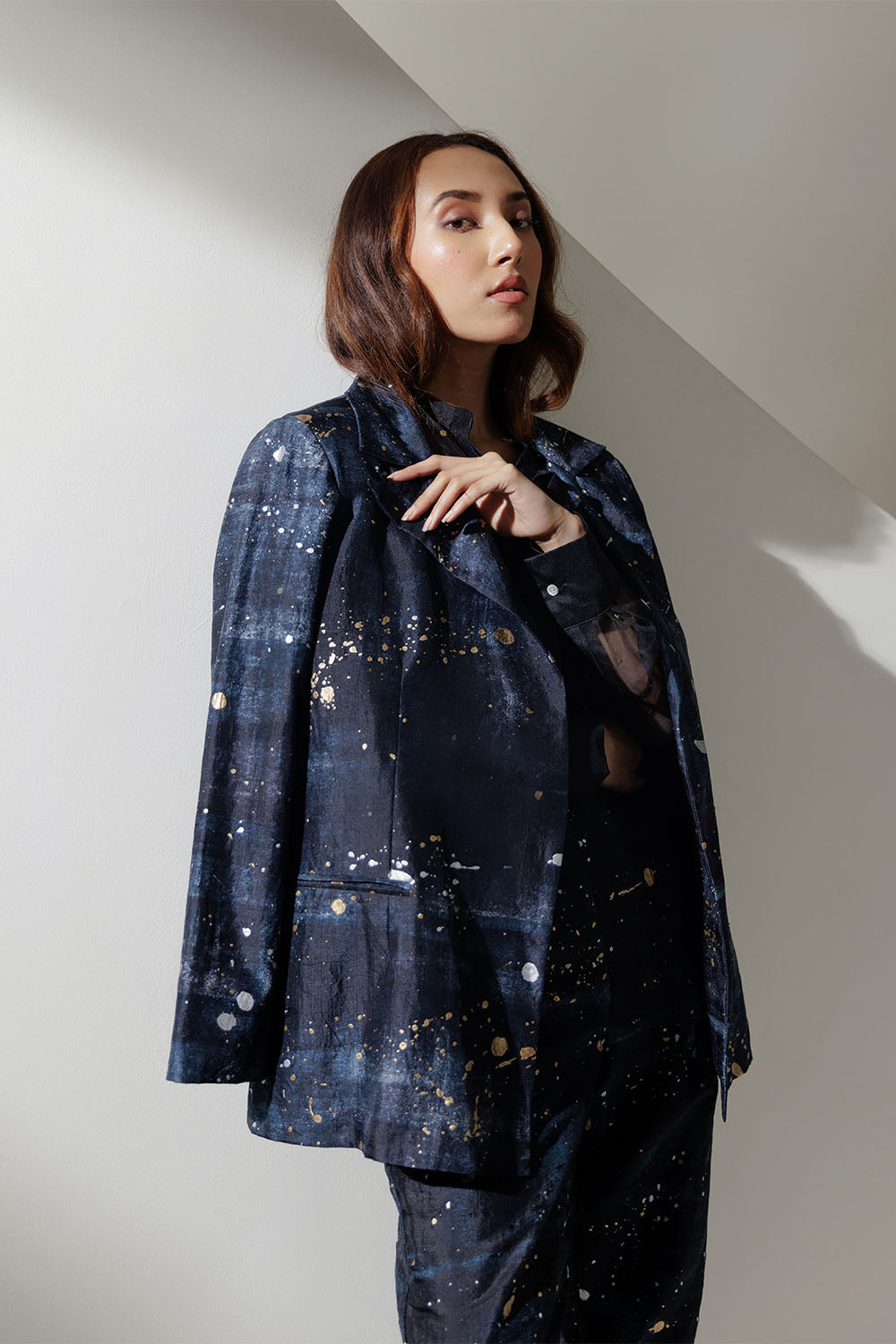 Splatter print hanwoven mulberry silk boxy fit blazer.