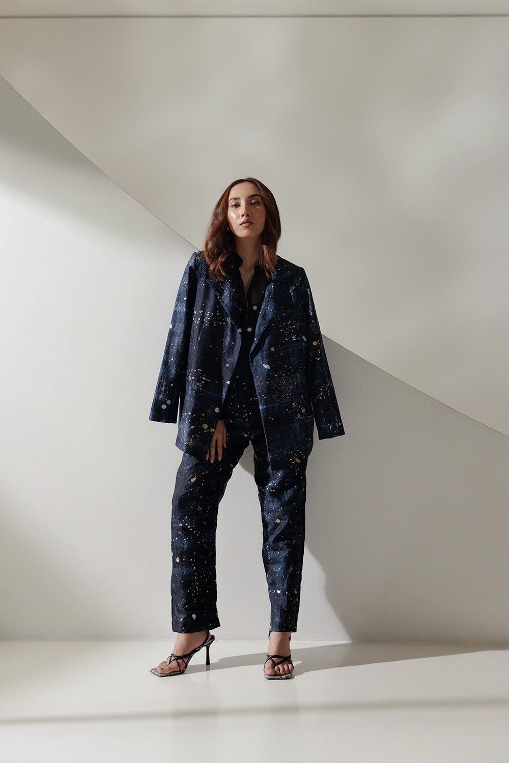 Splatter print hanwoven mulberry silk boxy fit blazer.