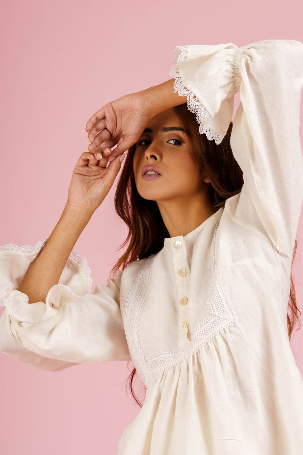 Handwoven linen blouse with lace trims and straight linen pants