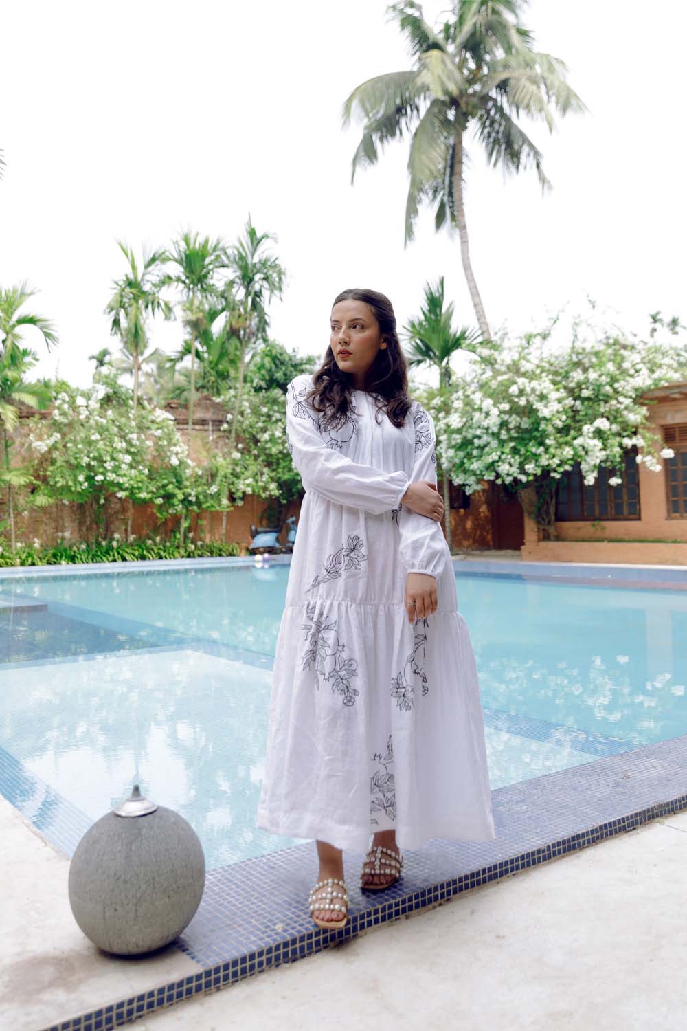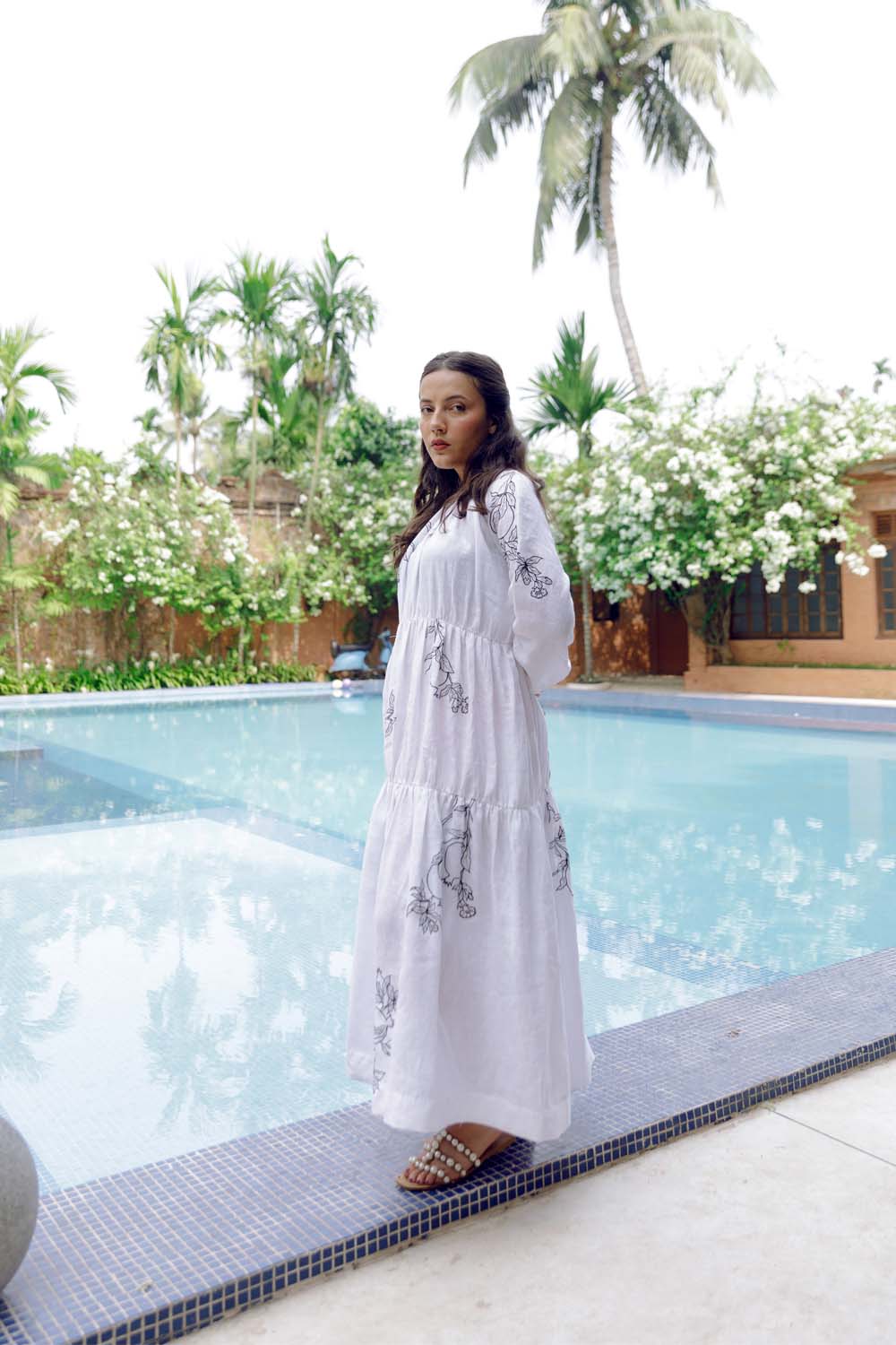 White linen tiered and gathered midi dress with black motif embroidery and bead work on the collar. The dress also has pockets on each side.