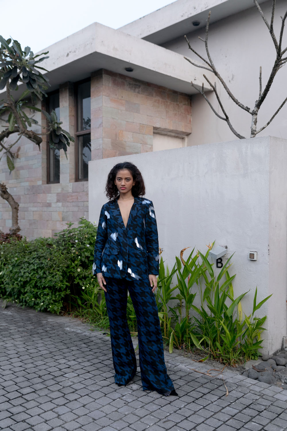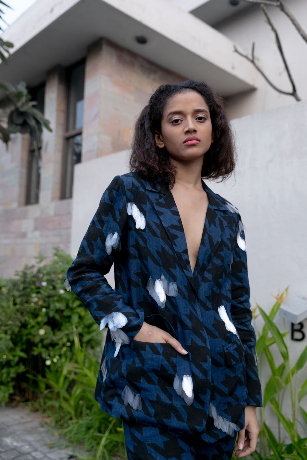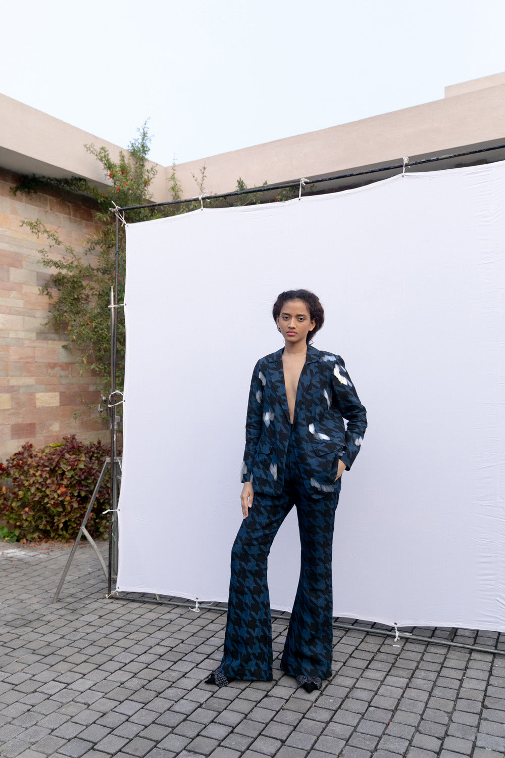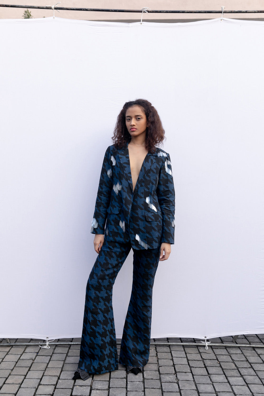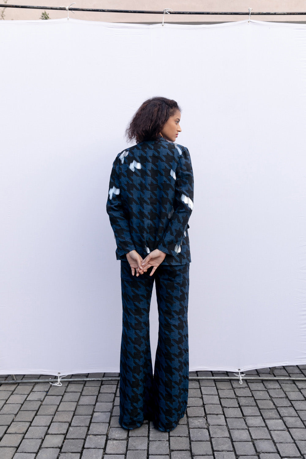 Block printed handwoven linen blazer and bell bottom set with sustainable sequin embroidery