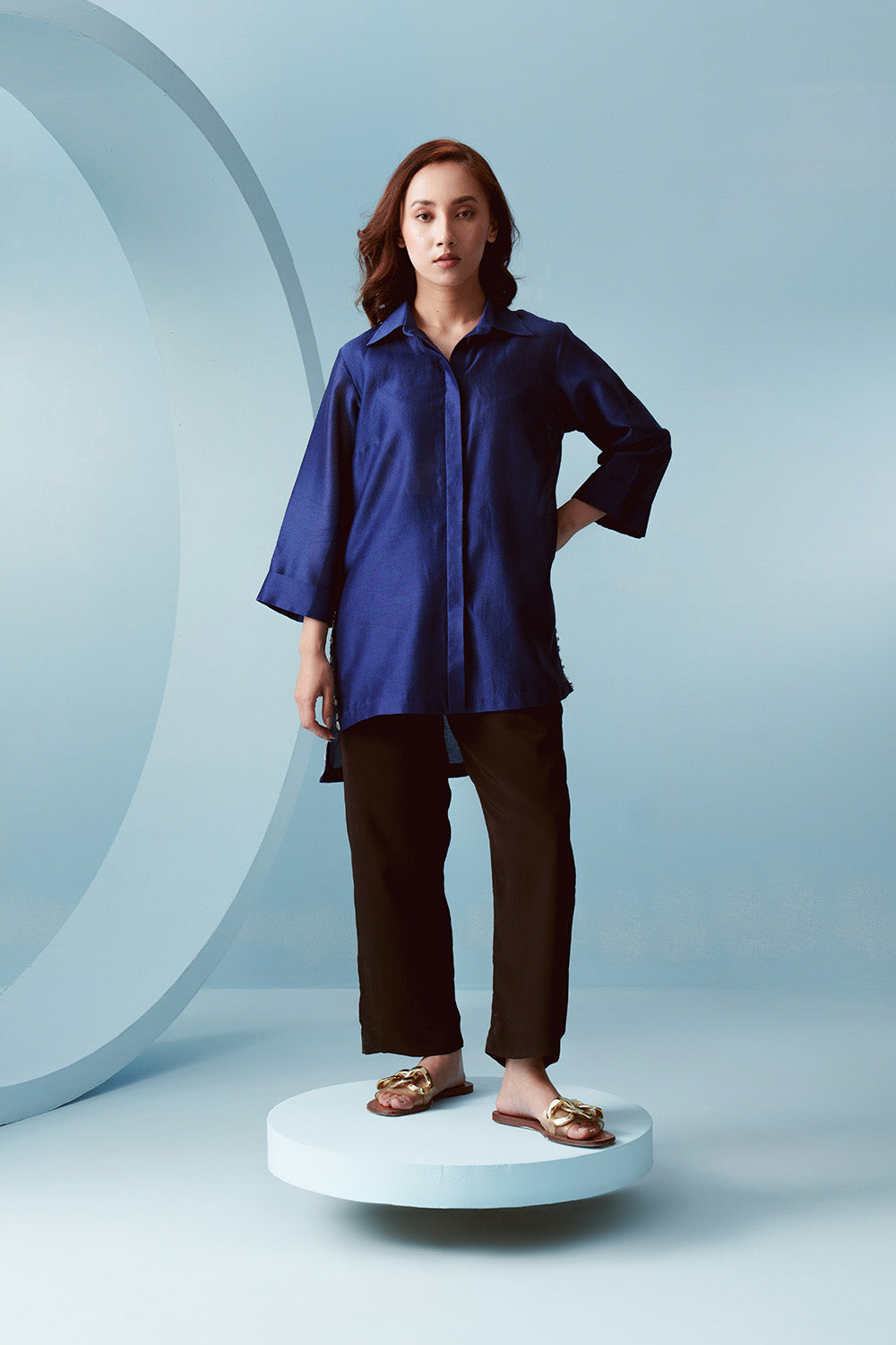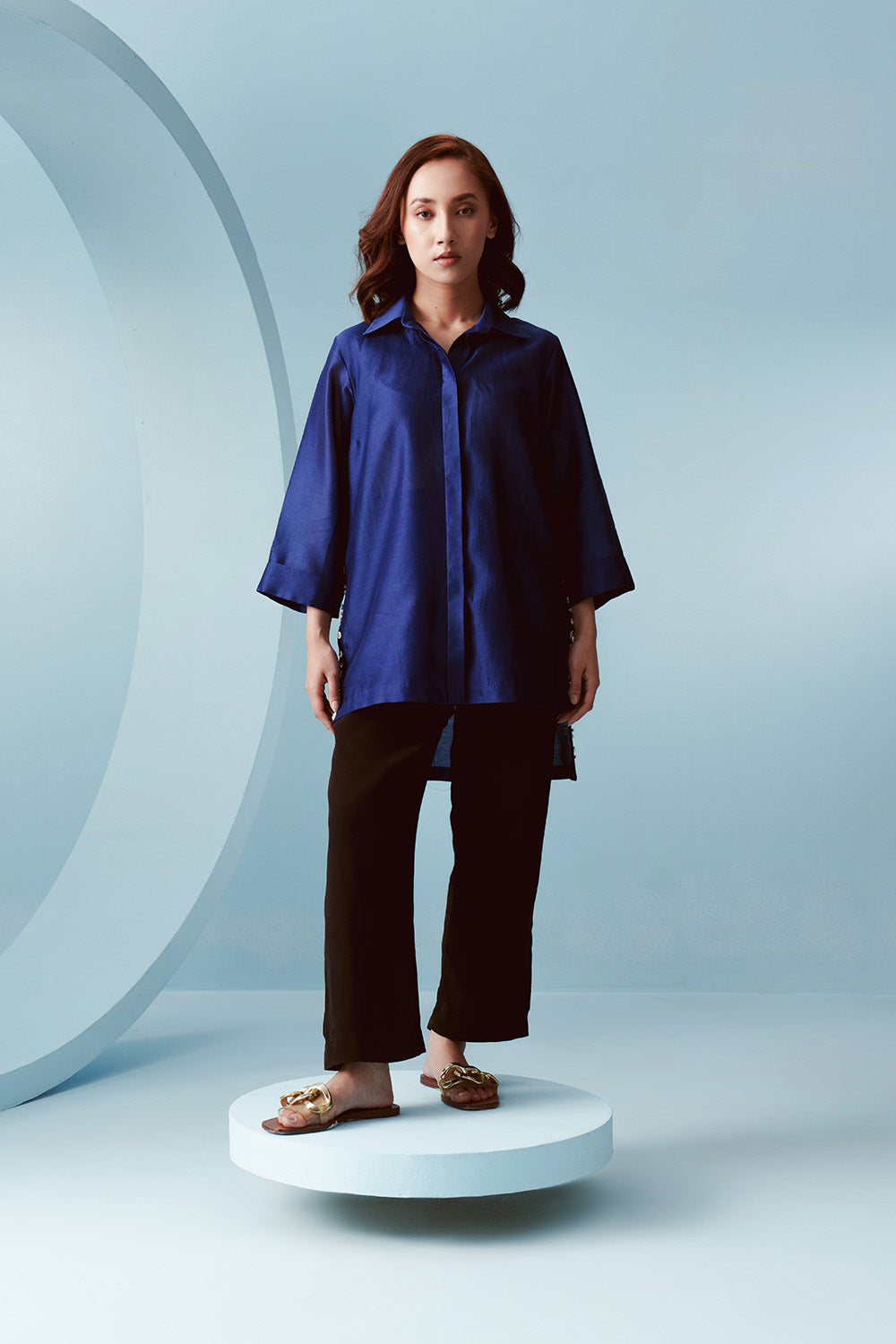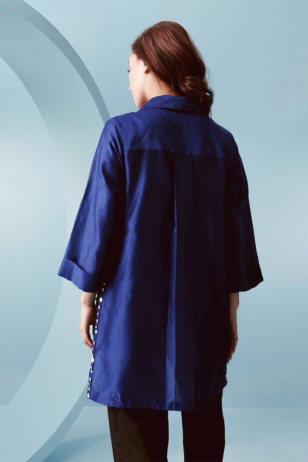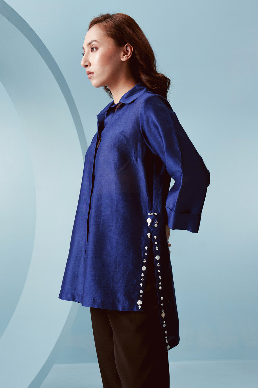 Boxy fit chanderi shirt with a longer back and embellished high side slits.