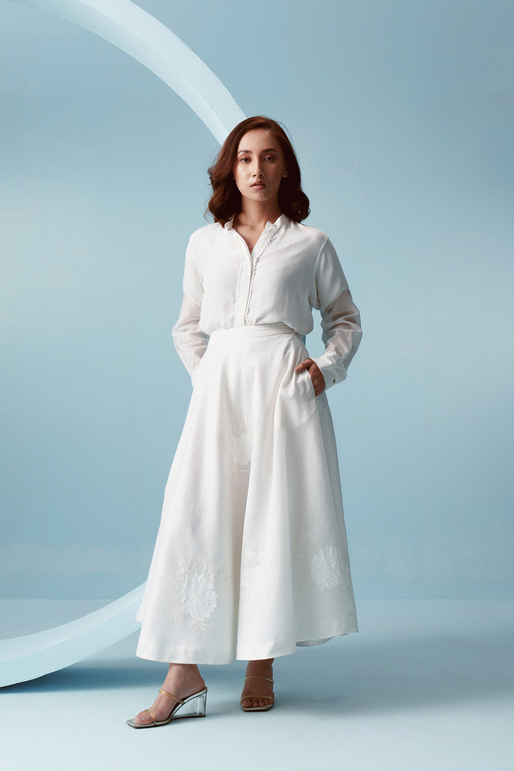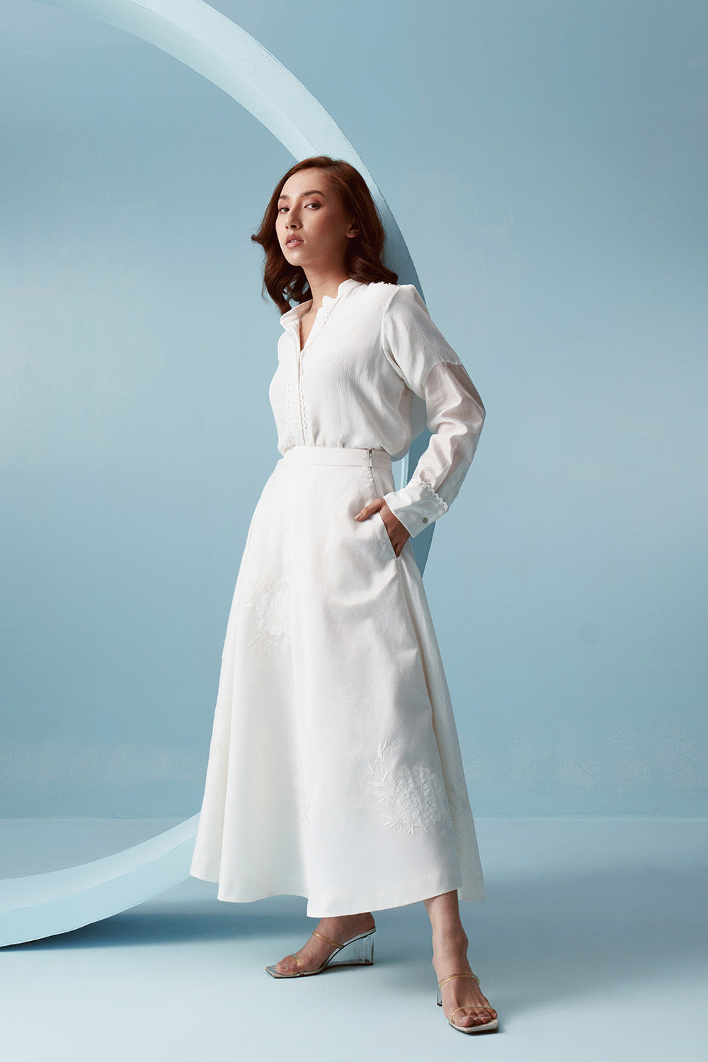 Full circle bias cut, high waisted skirt, with tonal white applique embroidery.