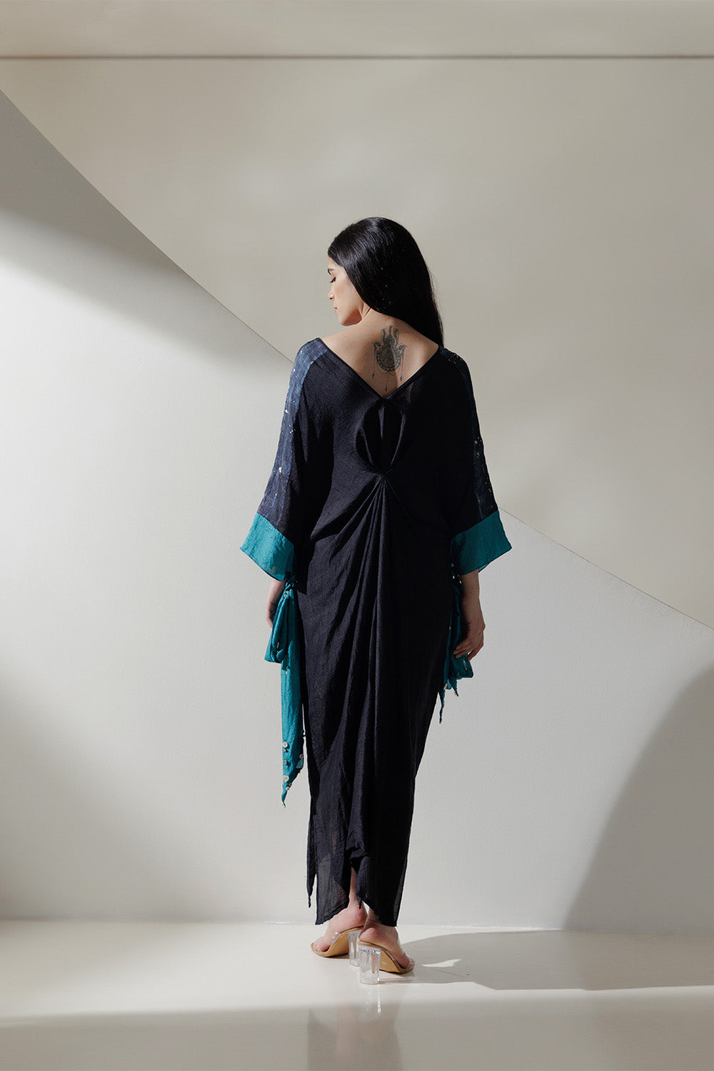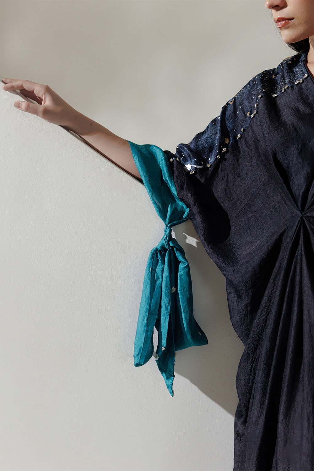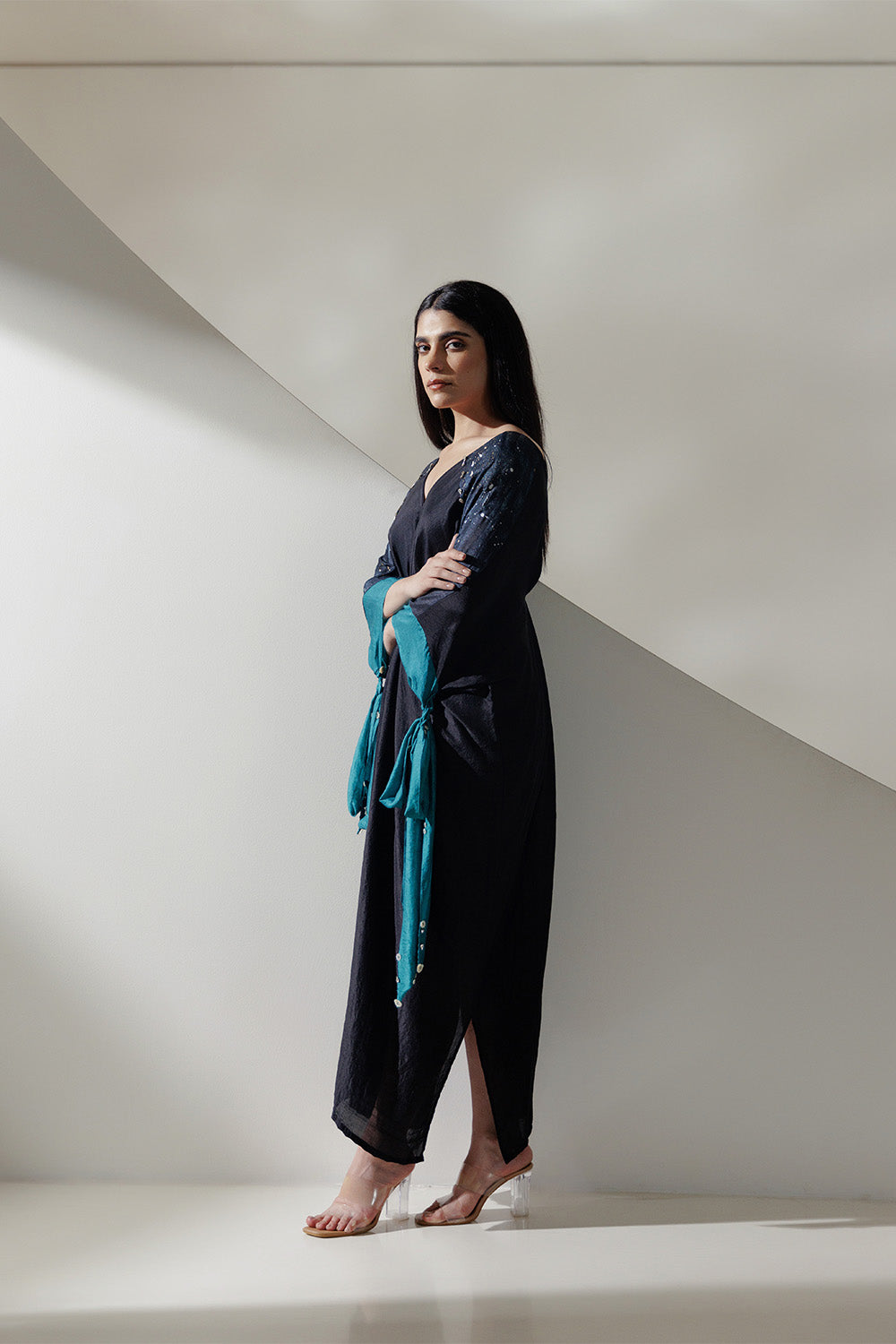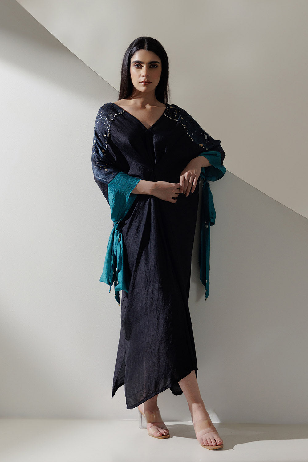 Black handwoven mulberry kaftaan with teal tie up cuffs embroidered with mother of pearl shells and rhinestone.