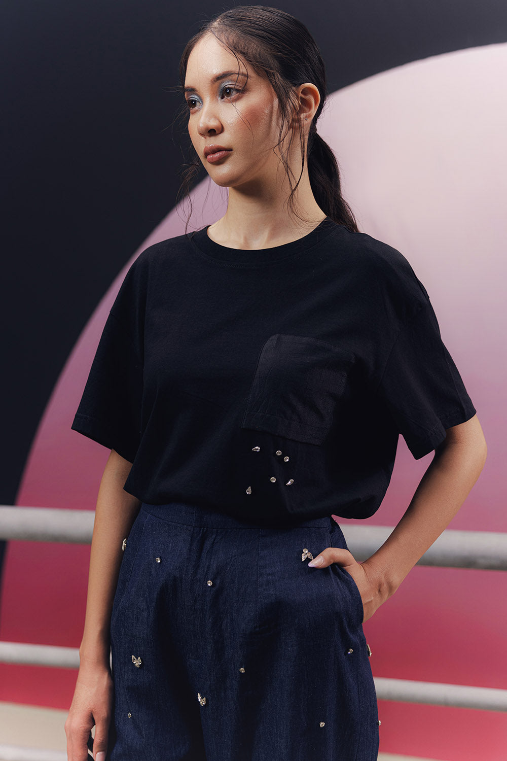Round neck cotton tshirt with an inverted black silk pocket and placement diamonte embroidery