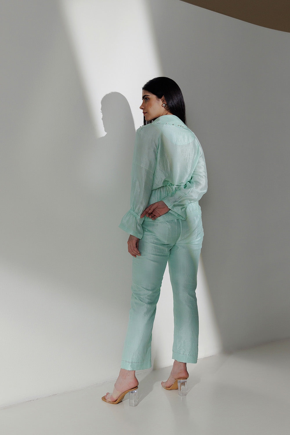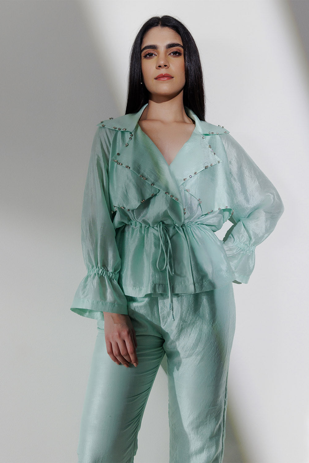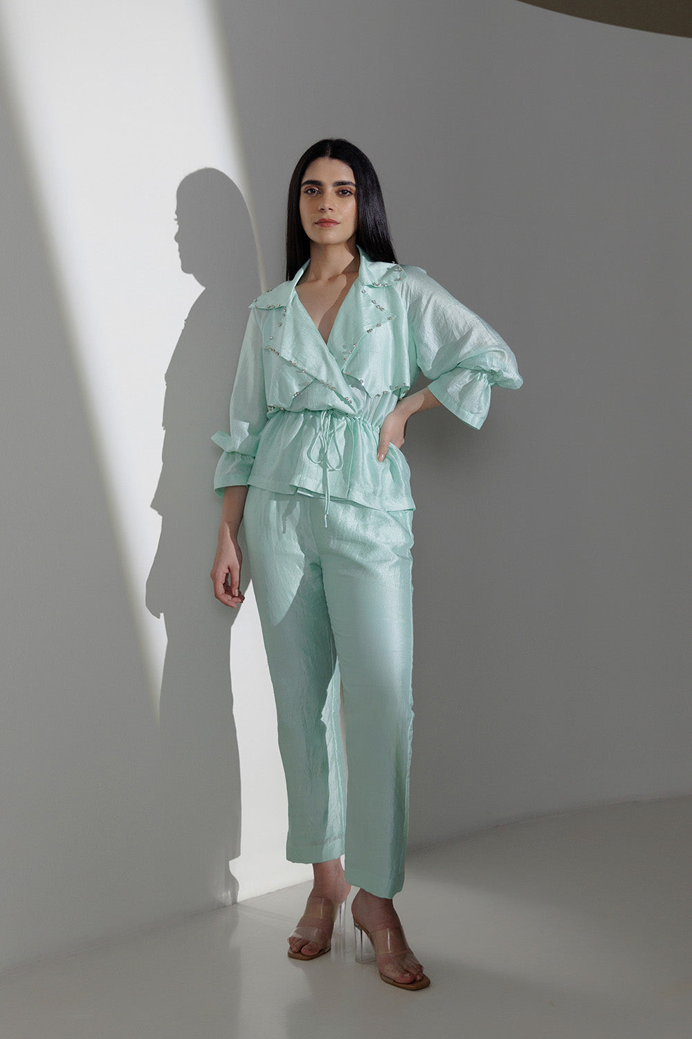Mint handwoven mulberry silk, overlapped jacket style tie-up co-ord set with assorted rhinestone embroidery on the front. The fit is comfortable and the sleeves have a playful elastic detail.
