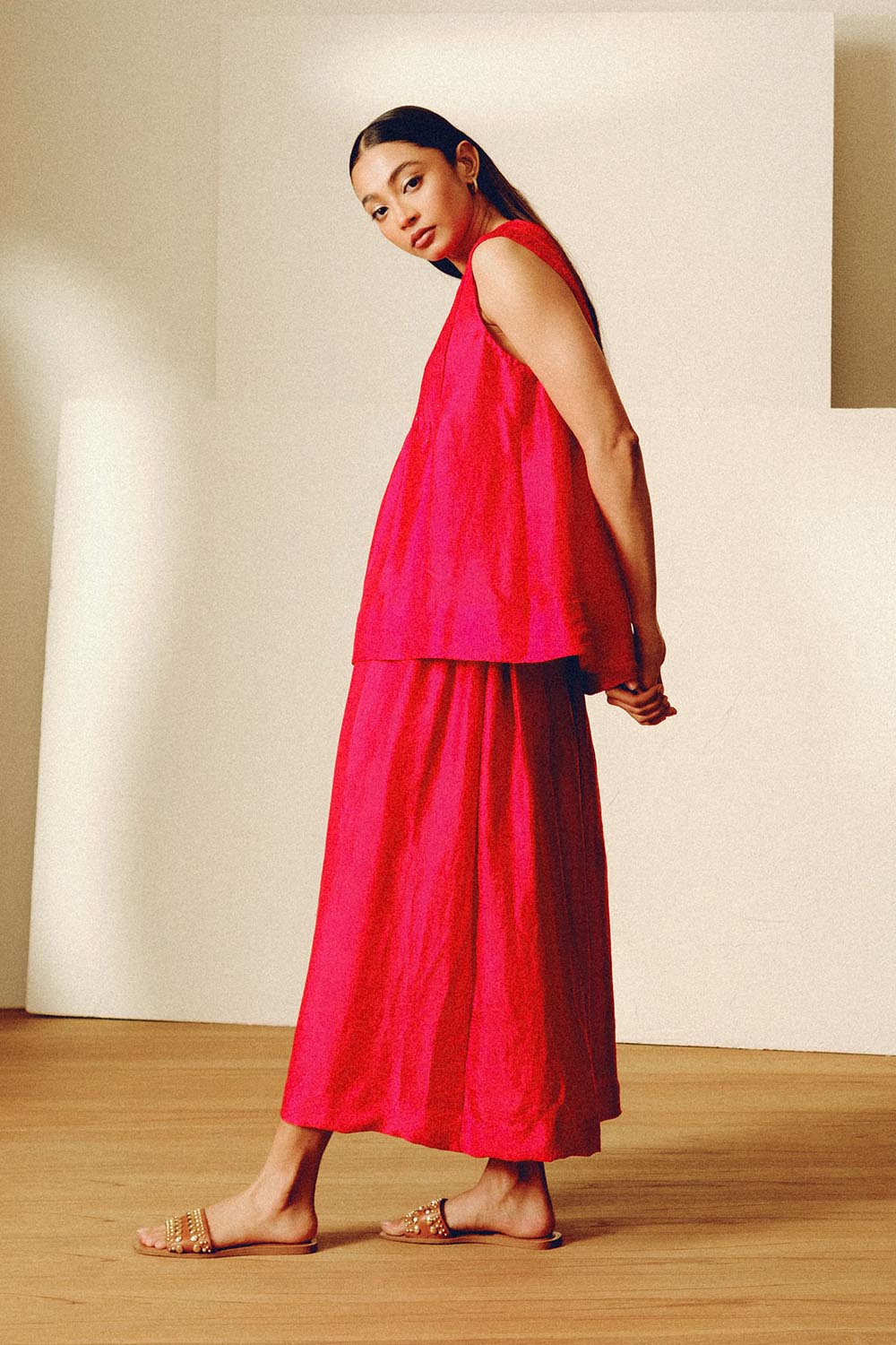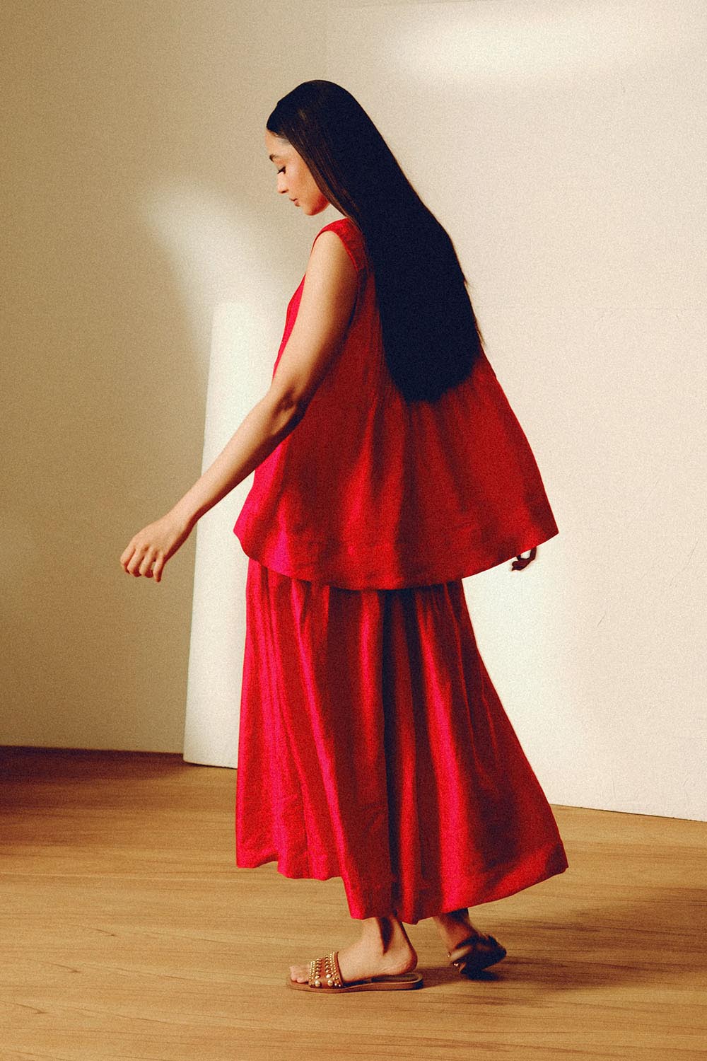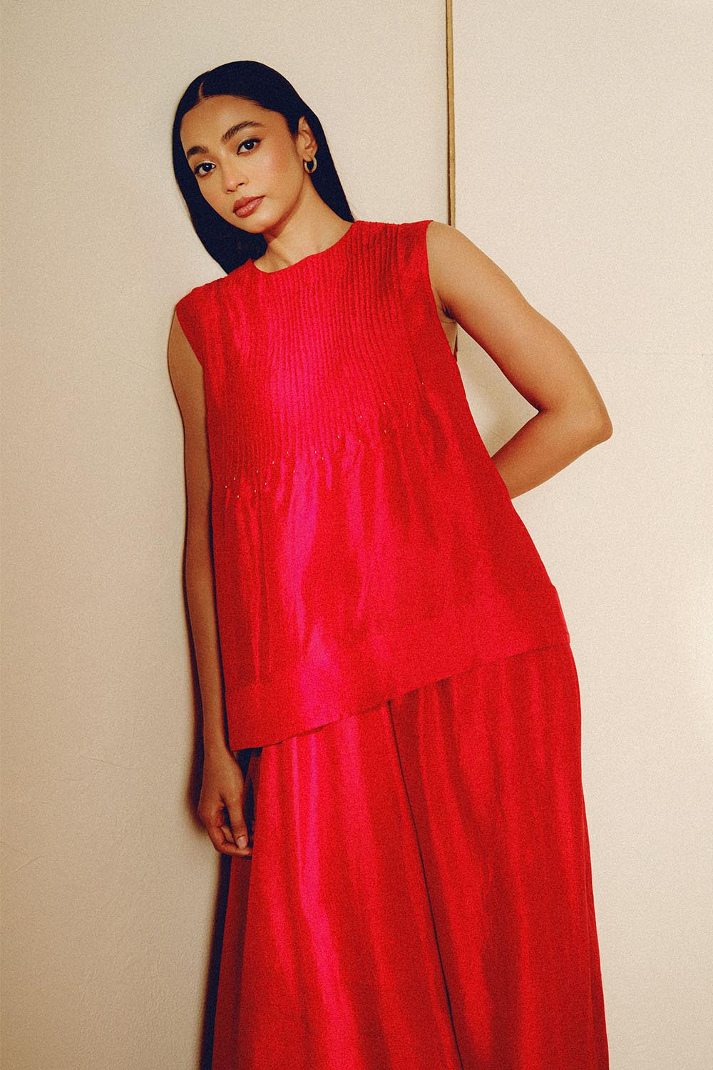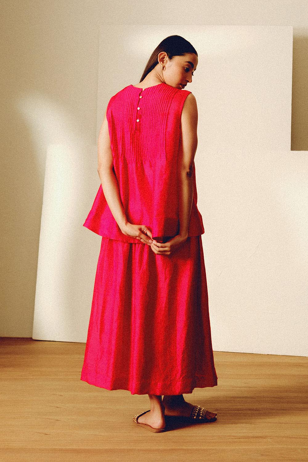 Handwoven mulberry silk sleeveless top with front and back pintucks and highlighted with metallic bead edging. The top is paired with a solid matching midi skirt.