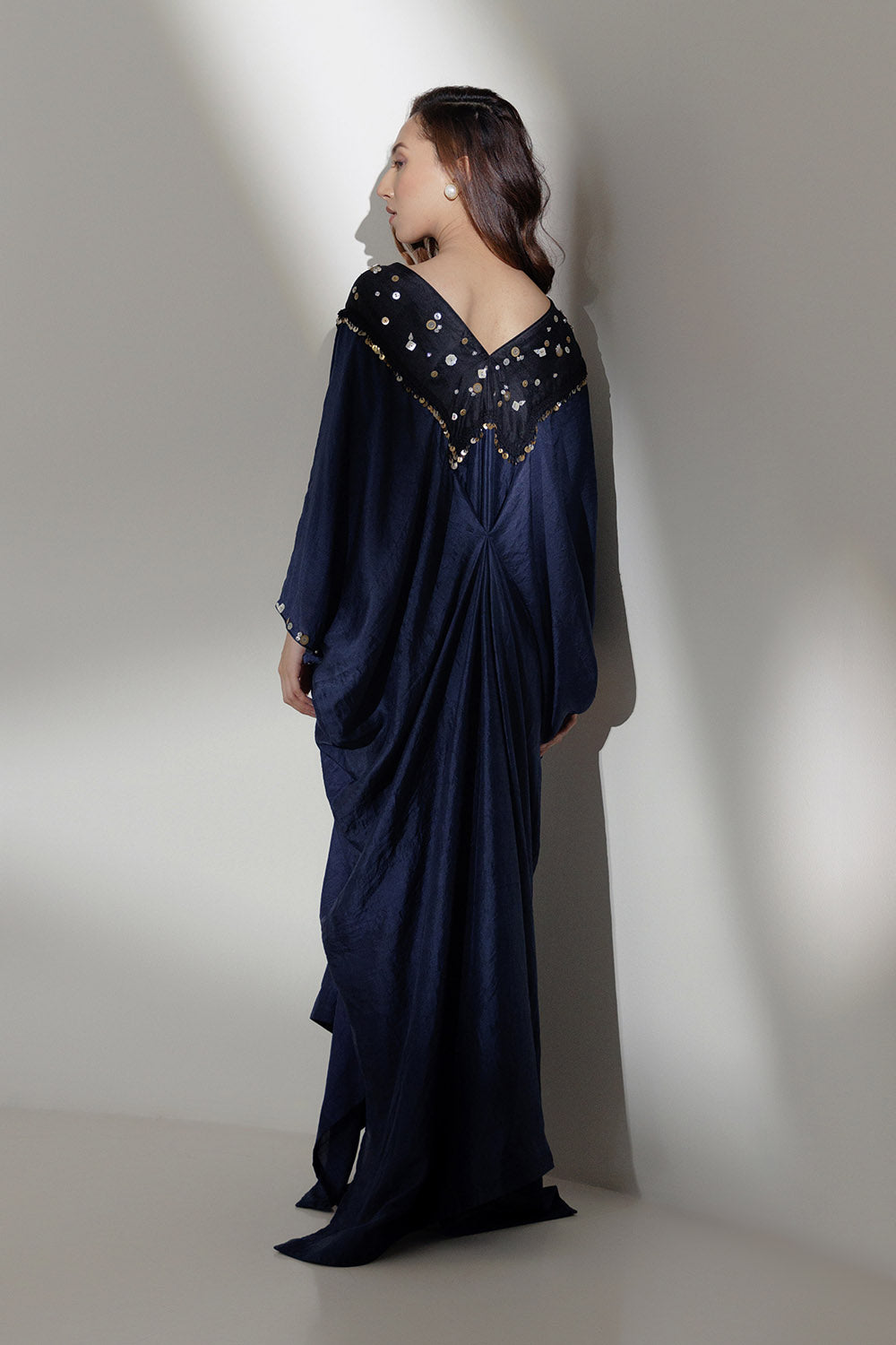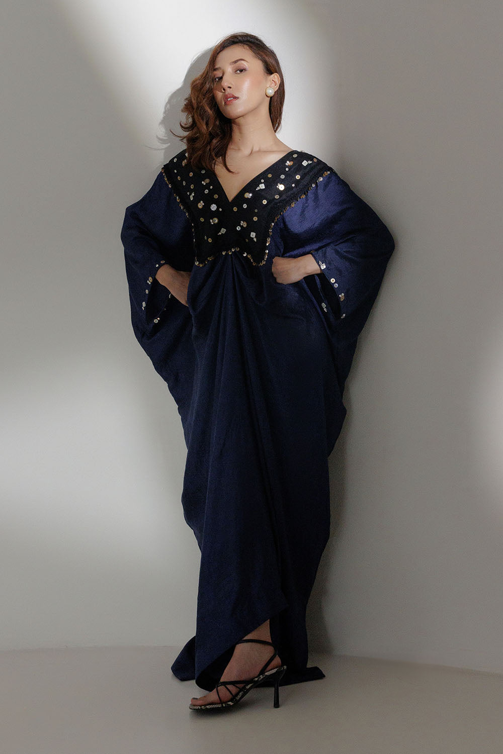 Navy handwoven mulberry silk kaftan with a contrast emboidered neck yoke. The front sports a figure flattering drape where as the back has a clean tack at the waist. The style is a free size with a front and back deep V neck and side slits.