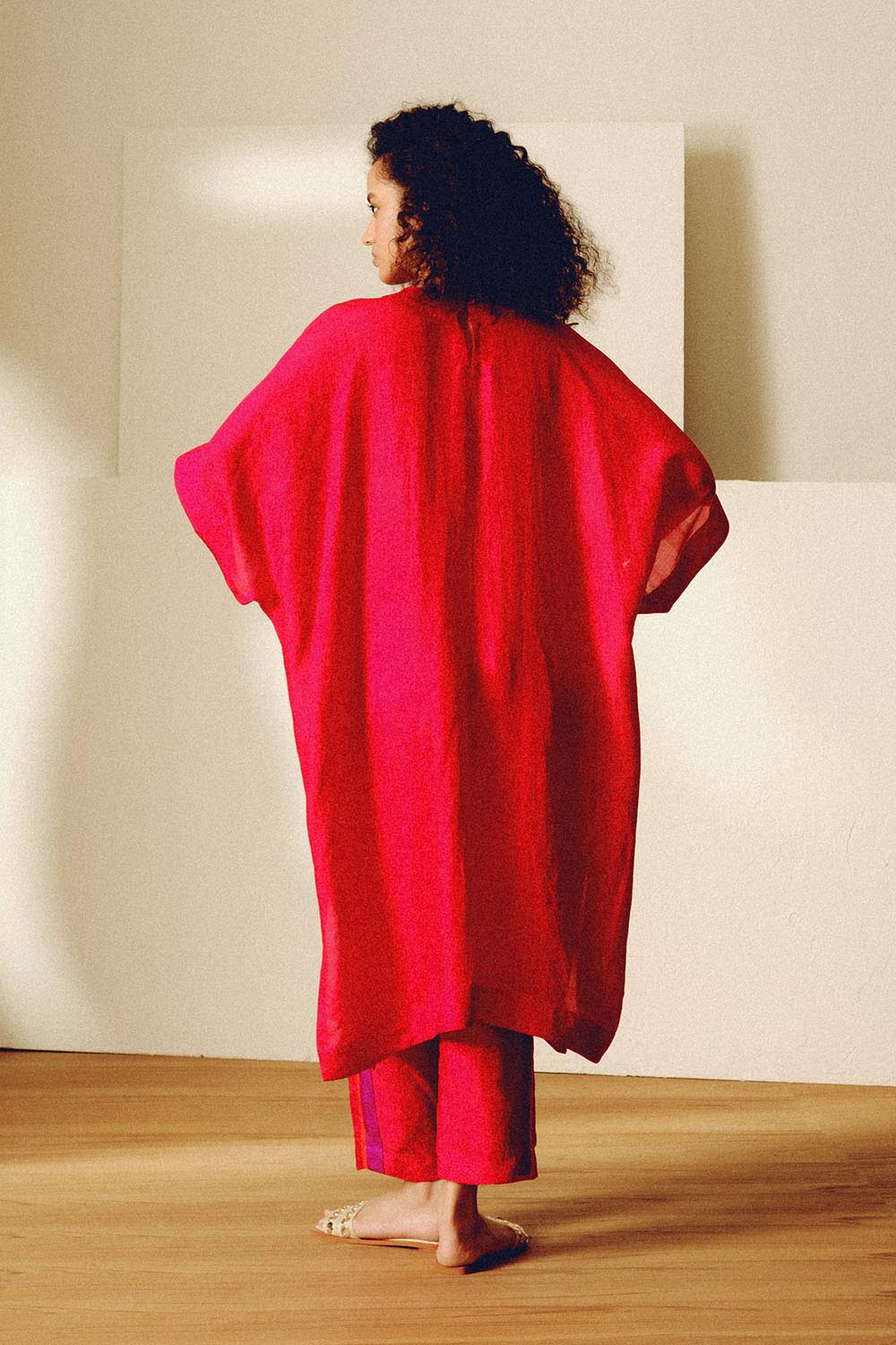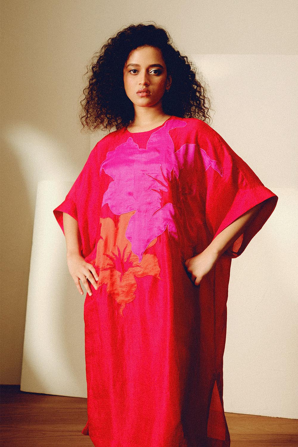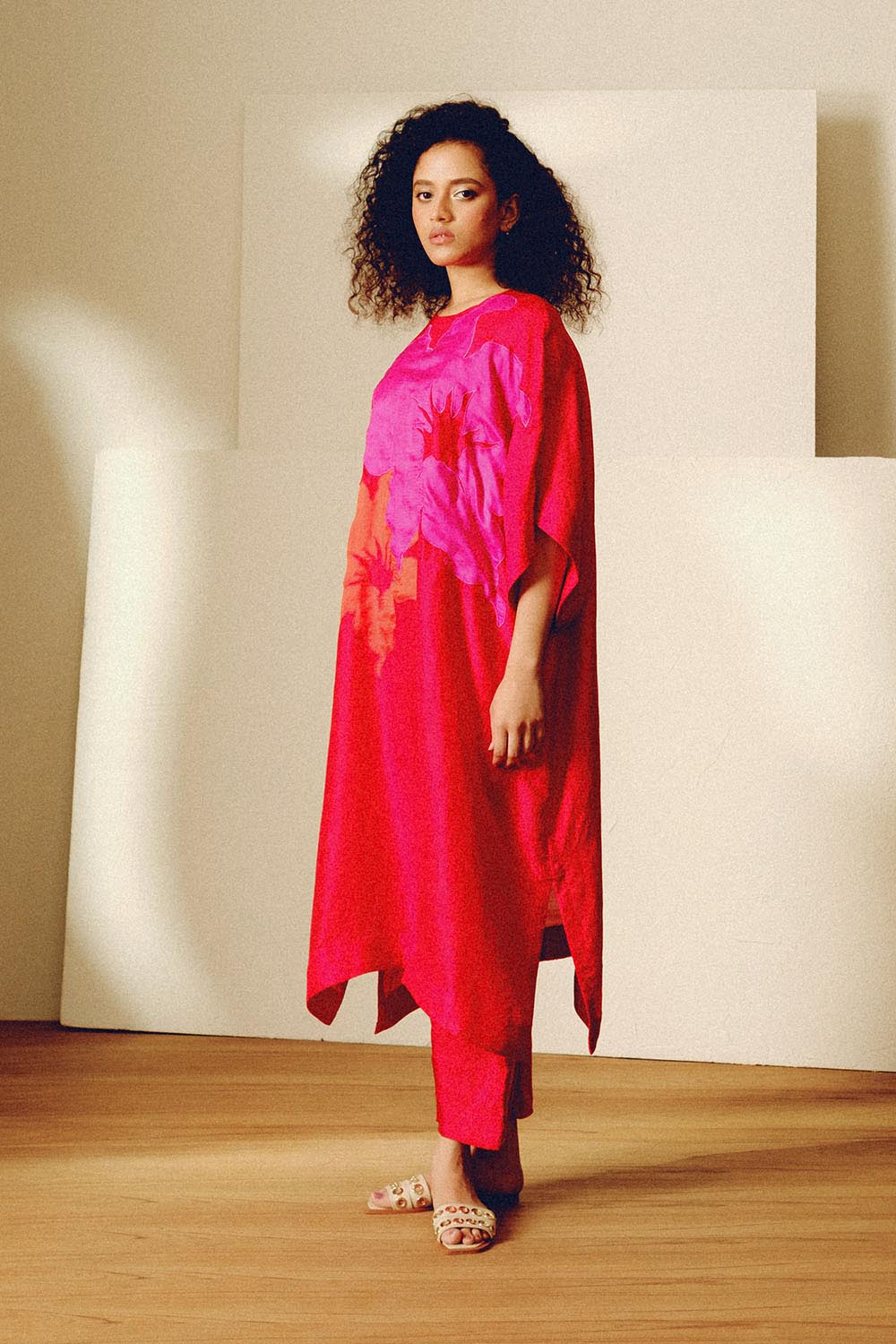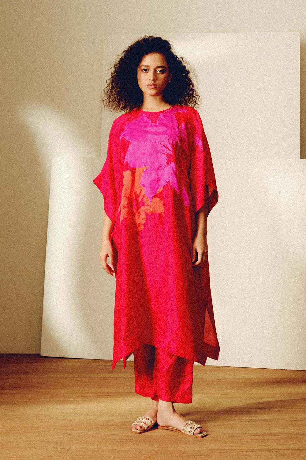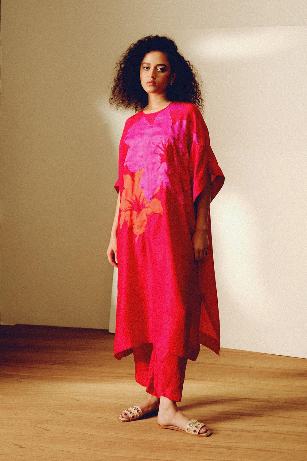 Handwoven mulberry silk free sized tunic with contrast floral applique and matching narrow pants.