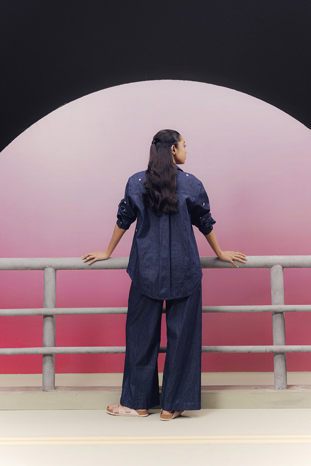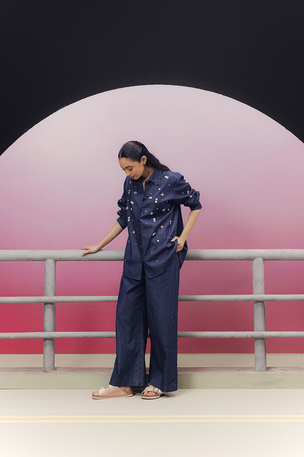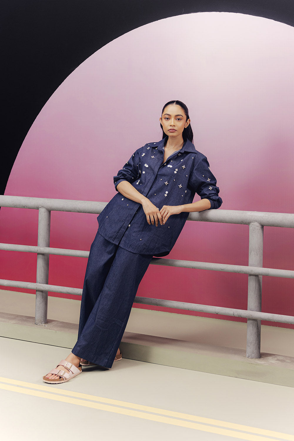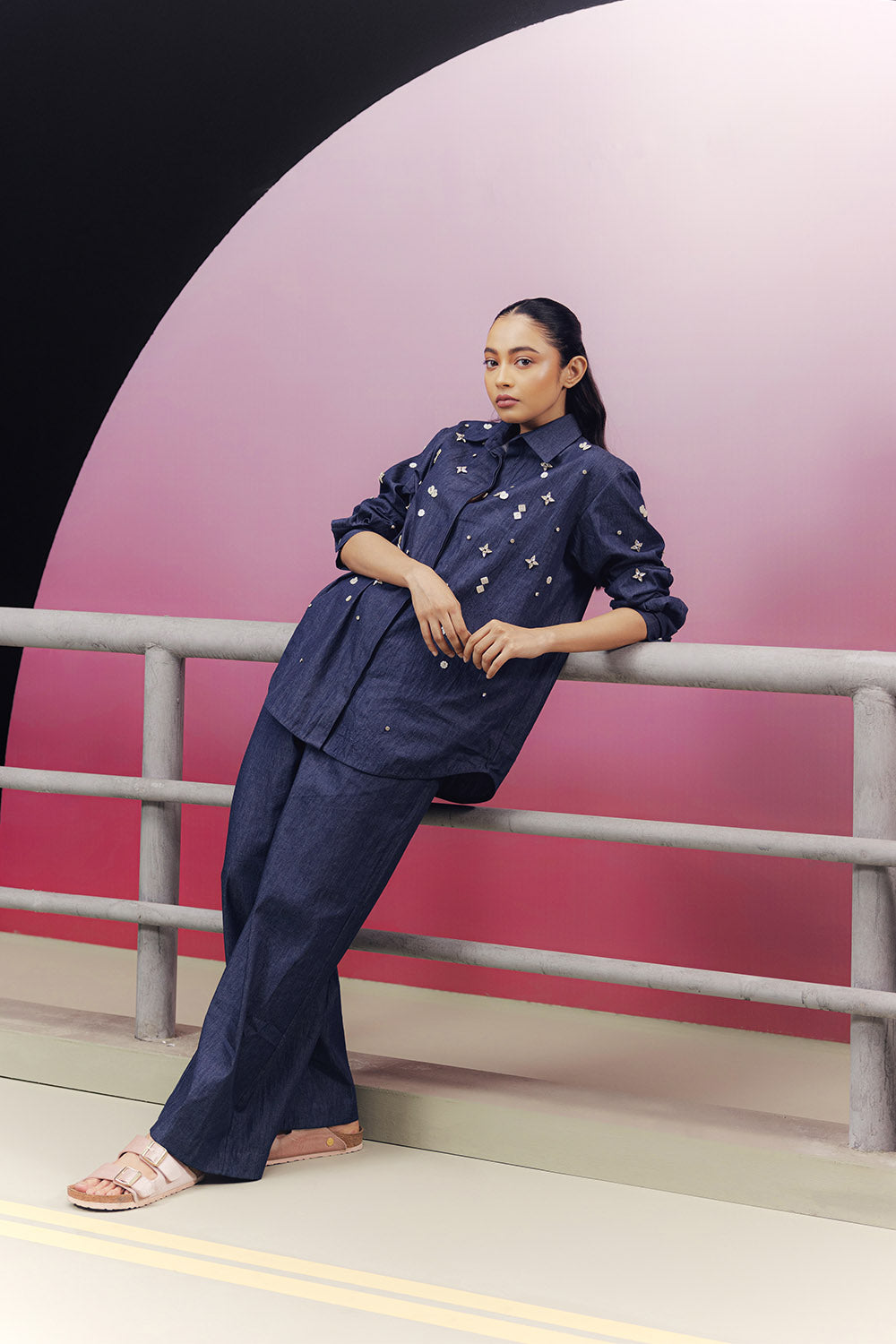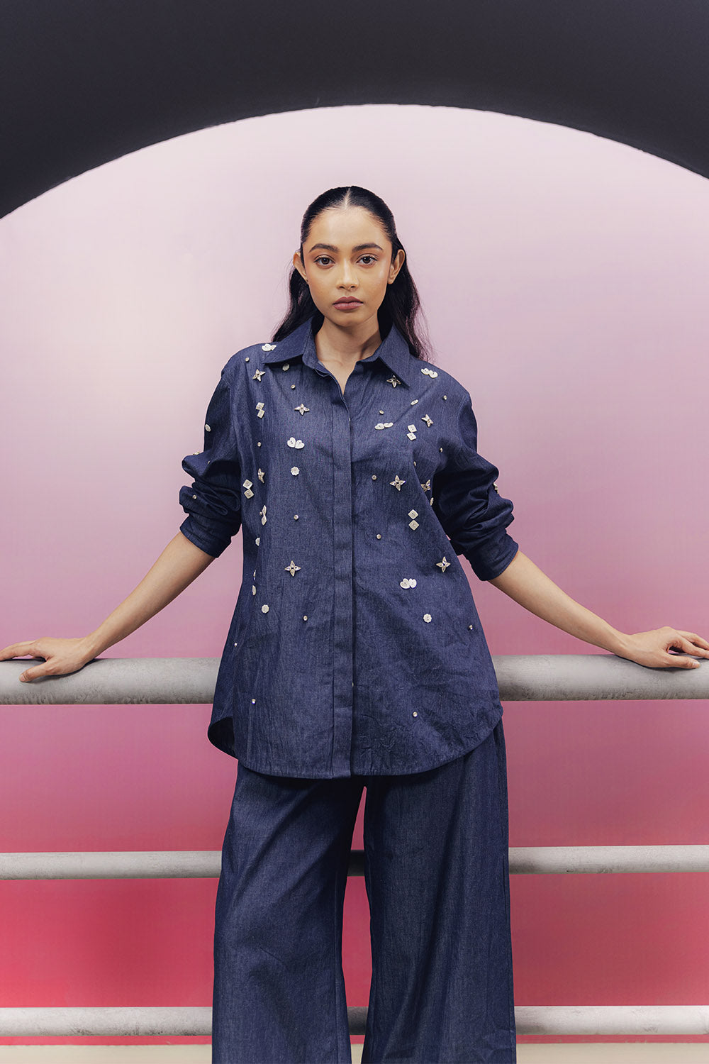 Indigo denim embroidered co-ord set with a relaxed shirt and drawstring style pajama pants
