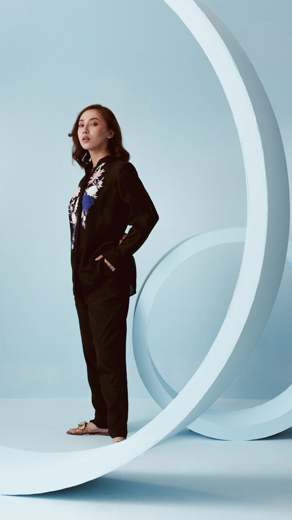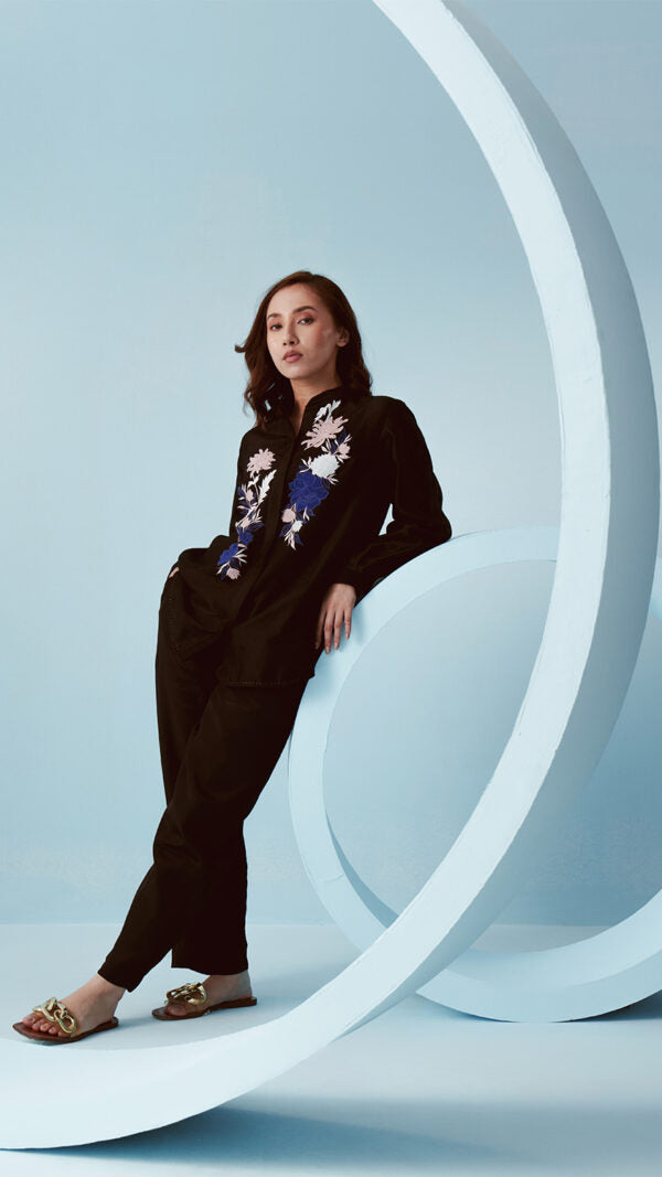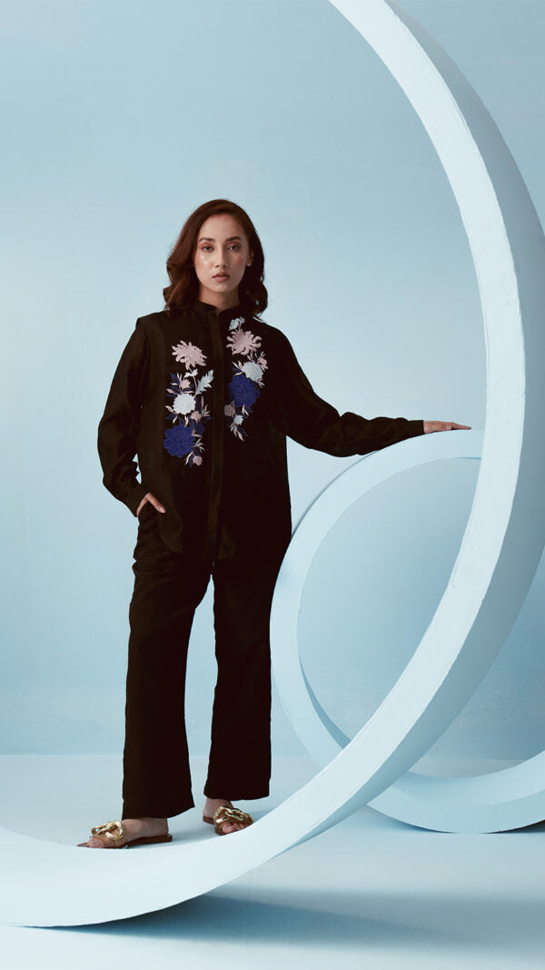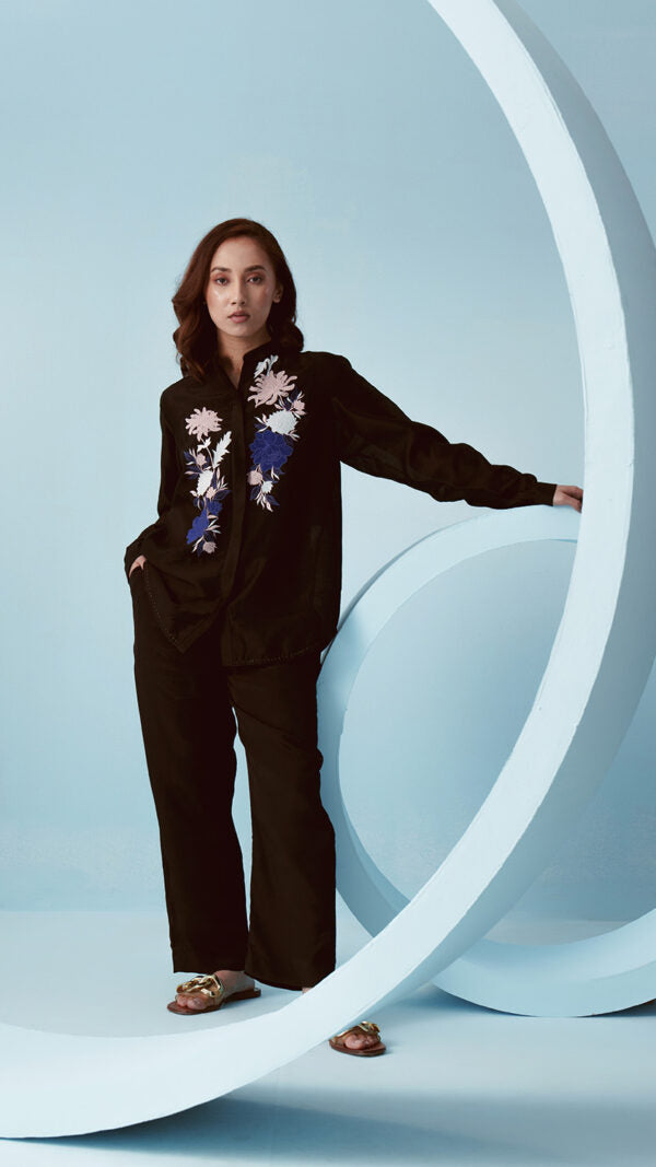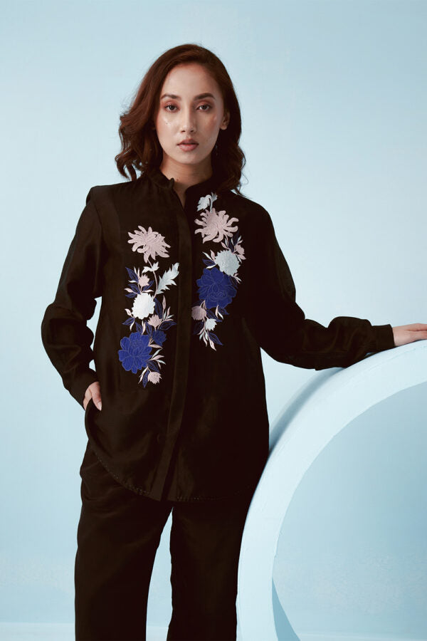 Black Chinese collar straight fit chanderi shirt with an opaque crepe long applique embroidered front and back yoke.